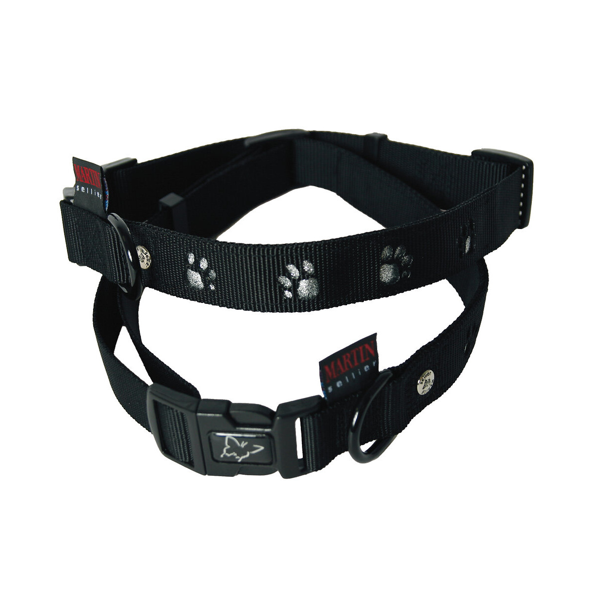 Collier Pattes silver pour chien en nylon. Coloris : pattes silver. Motifs découpés dans la sur-épaisseur. Accessoires laqués noirs. Bouclerie rapide et en plastique. Dimensions : Largeur 16 mm x Longueur 30/45 cm.