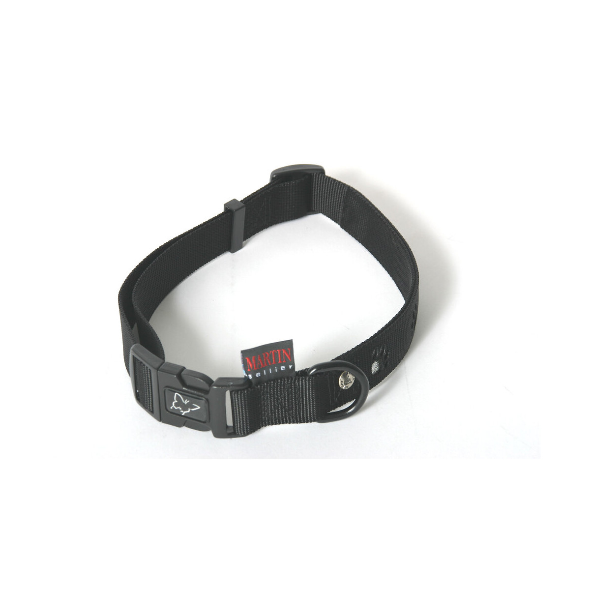 Collier Pattes silver pour chien en nylon. Coloris : pattes silver. Motifs découpés dans la sur-épaisseur. Accessoires laqués noirs. Bouclerie rapide et en plastique. Dimensions : Largeur 25 mm x Longueur 45/65 cm.