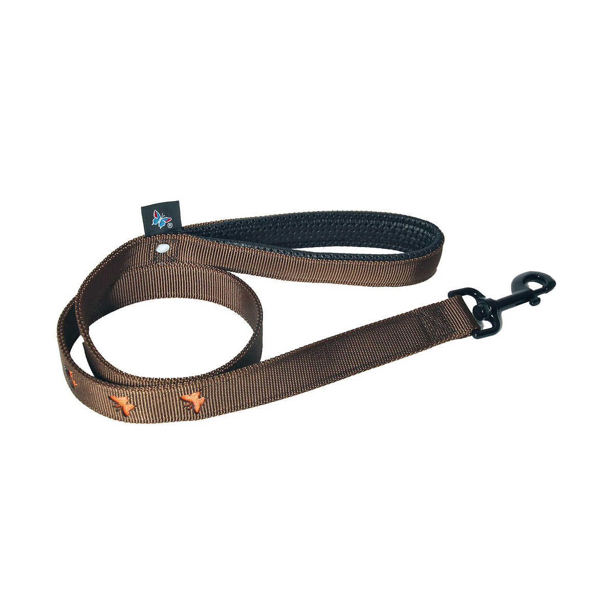Laisse Papillons orange pour chien en nylon. Coloris : papillons orange. Motifs découpés dans la sur-épaisseur. Mousqueton carabine laqué noir. Dimensions : Largeur 25 mm x Longueur 100 cm.