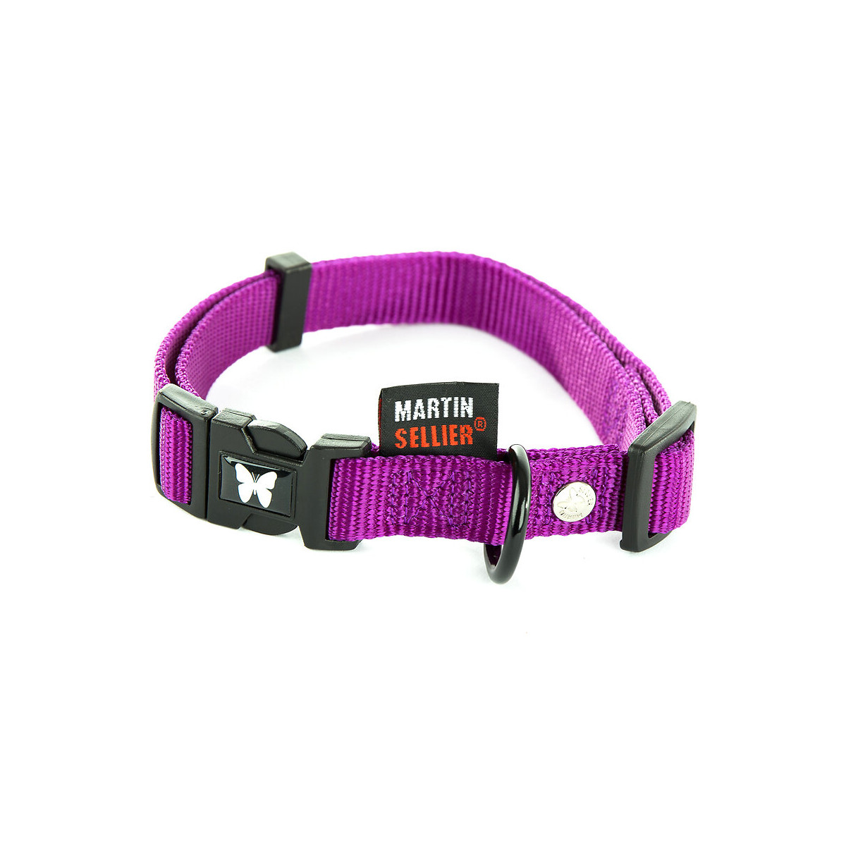Collier Réglable pour chien en nylon. Coloris : mauve. Boucle rapide et accessoires en plastiques acétal connu pour sa grande résistance à la traction. Anneau D laqué noir. Haute résistance du collier. Jusqu'à 113 kg. Dimensions : Largeur 20 mm x Hauteur 18 cm.