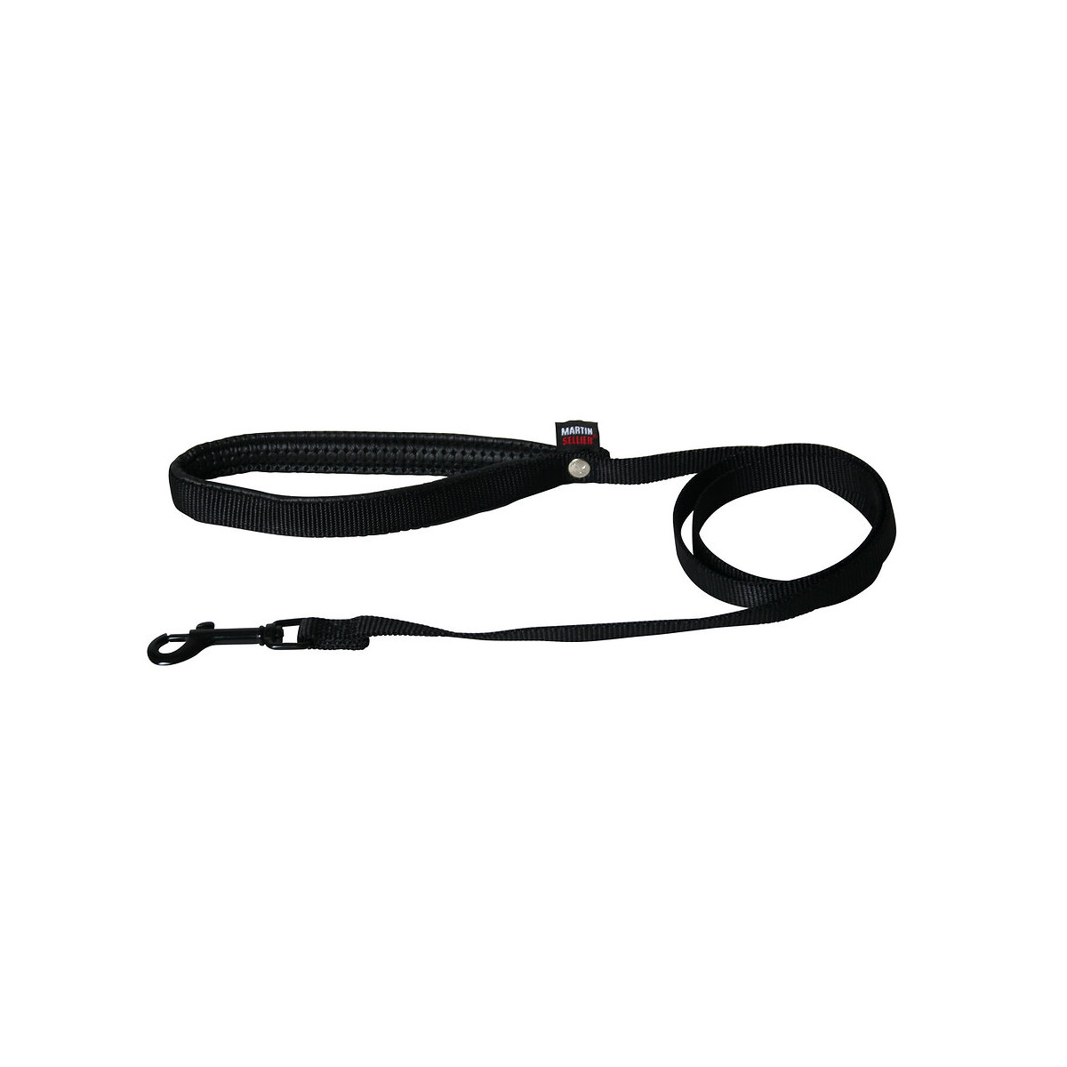 Laisse pour chien en nylon. Coloris : noir. Avec mousqueton carabine et poignée confort. Dimensions : Largeur 16 mm x Longueur 120 cm.