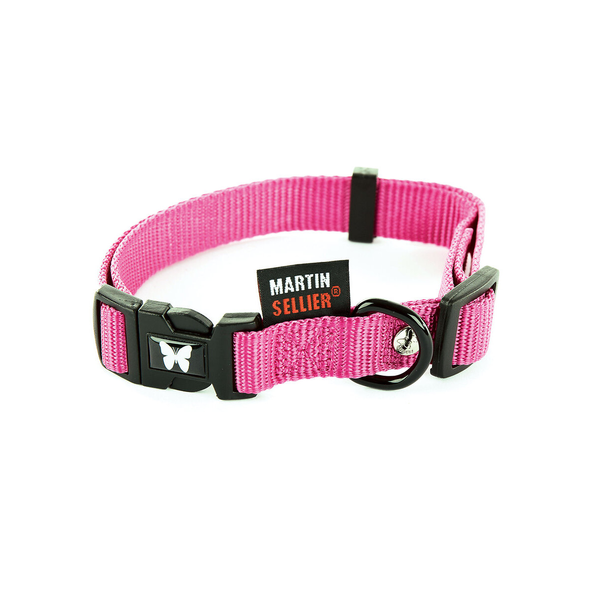 Collier Réglable pour chien en nylon. Coloris : rose. Boucle rapide et accessoires en plastiques acétal connu pour sa grande résistance à la traction. Anneau D laqué noir. Haute résistance du collier. Jusqu'à 36 kg. Dimensions : Largeur 40 mm x Hauteur 11 cm.