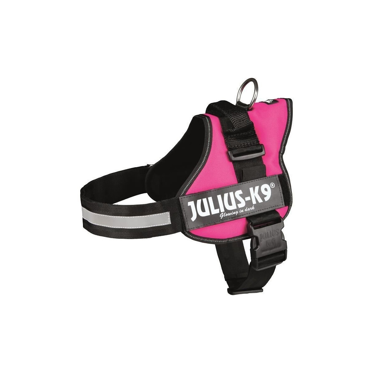 Harnais Power Julius-K9 - En nylon - 1/L : 66-85 cm/50 mm - Forme ergonomique - Tres robuste - Intérieur doux a la peau et respirant - Réglage intégral par sangles a la poitrine et au ventre - Sangle ventrale réfléchissante et bord de protection - Avec porte-lampe - Coloris : fuchsia - Pour chien.