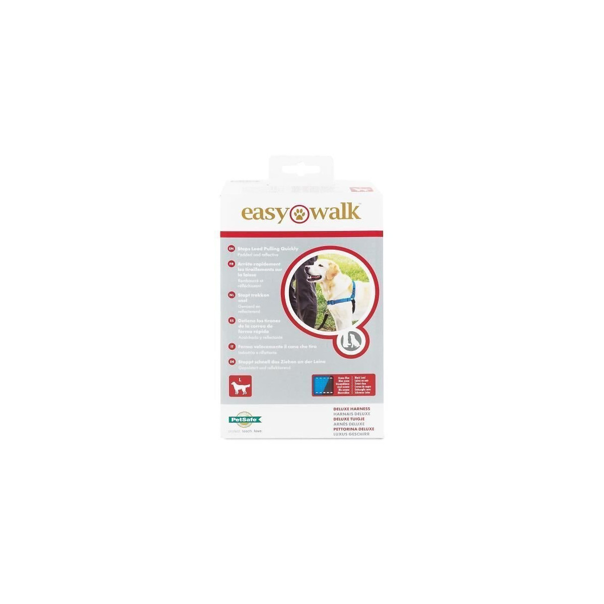 Harnais Deluxe L Easy Walk® - Conçu pour décourager les chiens de tirer sur la laisse en promenade - Ne provoque pas de toux, de pression ou de choc - Boucles a fermeture rapide - 4 points de réglage et une doublure en néoprene offrent un confort maximum - Réfléchissant - Laisse en nylon de 1,8 m incluse - Coloris : bleu océan.