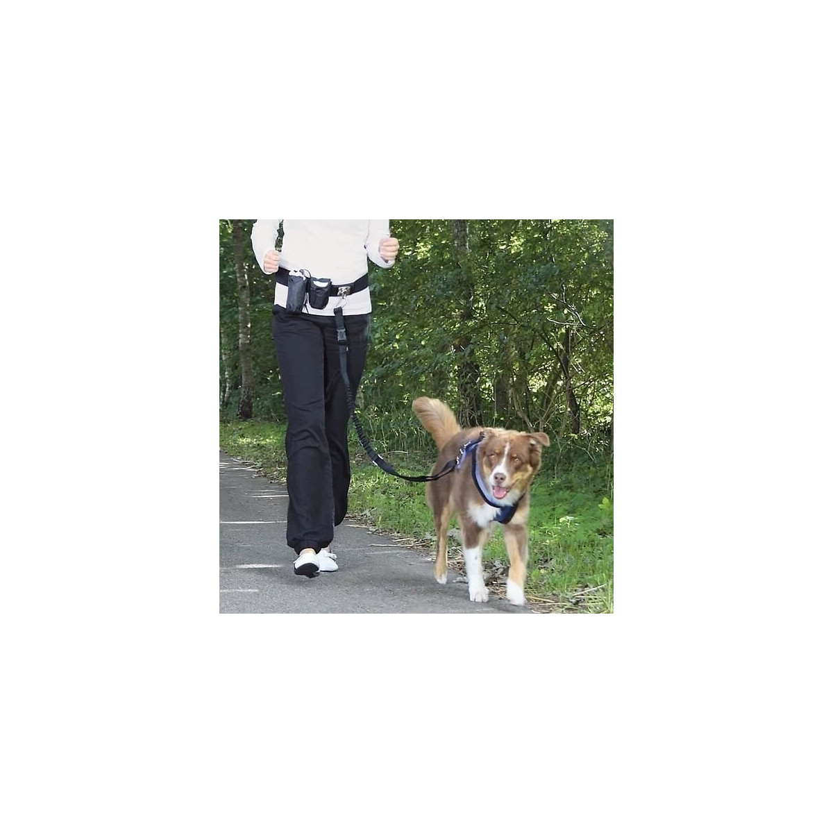 Ceinture ventrale avec laisse, jusqu'a 40 kg, noir pour Chien - en nylon tres résistant - convient parfaitement au jogging, a la marche - mains libres grâce a la ceinture élastique - le crochet spécial avec joints pivotants évite la torsade - les tractions soudaines sont atténuées par la laisse extensible et la ceinture élastique - 2 poches incluses pour téléphone portable, friandises, bouteille d'eau - bandes réfléc