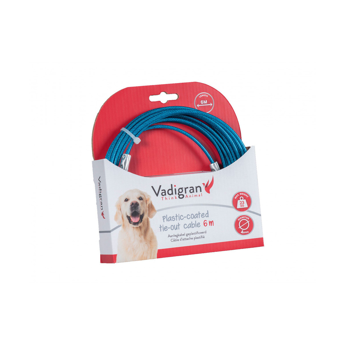 Câble d'attache gainée plastique bleu 6 Mètres. Max 23 kg pour chien. Ce câble revêtu de plastique est conçu pour garder votre chien en sécurité à l'extérieur ; il existe en différentes longueurs afin que vous puissiez choisir la taille la plus adaptée à votre propriété ou à vos besoins. Avec un mousqueton à chaque extrémité, il est facile de l'accrocher à un piquet, un poteau, ou à une boucle formée autour d'un poteau ou d'un arbre ; une façon astucieuse de garder votre compagnon à proximité, tout en lui limitant l'accès à votre zone de travail en extérieur. Câble d'attache gainée plastique bleu 6 Mètres. Max 23 kg pour chien. ø du câble 4 mm. Ce câble revêtu de plastique est conçu pour garder votre chien en sécurité à l'extérieur ; Avec un mousqueton à chaque extrémité, il est facile de l'accrocher à un piquet, un poteau, ou à une boucle formée autour d'un poteau ou d'un arbre ; une façon astucieuse de garder votre compagnon à proximité, tout en lui limitant l'accès à votre zone de travail en extérieur. Ce câble d'attache fera très bien le travail chaque fois que vous aurez besoin de retenir votre chien ; facile à détacher, il est portable et pratique pour les voyages. Garde les chiots à l'écart des lieux ou zones qui pourraient représenter un danger pour eux ; utile pour les petits chiens qui arrivent à passer sous les barrières, même si votre jardin est clôturée. Ce produit indispensable pour animaux domestiques existe en plusieurs couleurs et tailles. C'est un cadeau astucieux à offrir à un ami ou parent qui vient d'avoir un chien. Simplifiez-vous la vie en tant que propriétaire de chien, grâce à ce câble d'attache avec revêtement en plastique et très résistant. Utilisez-le pour garder votre chien en sécurité et pour l'empêcher de s'approcher des zones dangereuses. Ce câble d'attache vous permet de laisser votre chien sortir sans courir le risque qu'il ne s'échappe. Le câble est recouvert d'une gaine en plastique, ce qui facilite son nettoyage, et équipé d'un mousqueton à chaque extrémité, donc facile à accrocher et à décrocher. Achetez plusieurs longueurs de câbles et utilisez-les dans votre jardin. C'est l'un des câble d'attache les plus solides sur le marché. Photo non contractuelle, car il y a plusieurs vendeurs sur une même fiche produit.