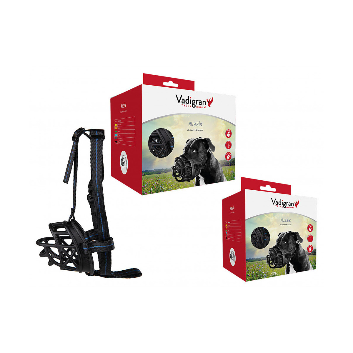Muselière caoutchouc noir .taille 6. pour type de chien Rottweiler. Fabriquée à l'aide d'un caoutchouc solide et durable, la muselière Vadigran constitue une protection et un accessoire idéal pour le dressage. Elle protège votre chien contre la tentation de mordre, de mâcher, contre les aboiements et l'envie de lécher ses plaies. Elle est très facile à mettre et à régler à la bonne taille. La muselière permet de faire boire votre chien, de le laisser haleter ou encore de lui donner des friandises. Ne serrez donc pas trop la muselière ! CONSEIL ! Apprenez à votre chien à supporter la muselière dès son plus jeune âge et récompensez-le chaque fois qu'il la porte. Muselière caoutchouc noir . taille 6. pour type de chien Rottweiler. Fabriquée à l'aide d'un caoutchouc solide et durable, la muselière Vadigran constitue une protection et un accessoire idéal pour le dressage. Elle protège votre chien contre la tentation de mordre, de mâcher, contre les aboiements et l'envie de lécher ses plaies. Elle est très facile à mettre et à régler à la bonne taille. La muselière permet de faire boire votre chien, de le laisser haleter ou encore de lui donner des friandises. Ne serrez donc pas trop la muselière ! CONSEIL ! Apprenez à votre chien à supporter la muselière dès son plus jeune âge et récompensez-le chaque fois qu'il la porte. La muselière a une large ouverture ajustable et est équipée d'une lanière supplémentaire pour la tête, de sorte que les chiens avec un large museau bénéficient aussi d'un port confortable. Avec cette muselière, votre chien peut haleter et boire. La muselière offre une solution aux comportements agressifs, à l'angoisse et par exemple, au fait de ne pas pouvoir lécher une blessure. Photo non contractuelle, car il y a plusieurs vendeurs sur une même fiche produit.