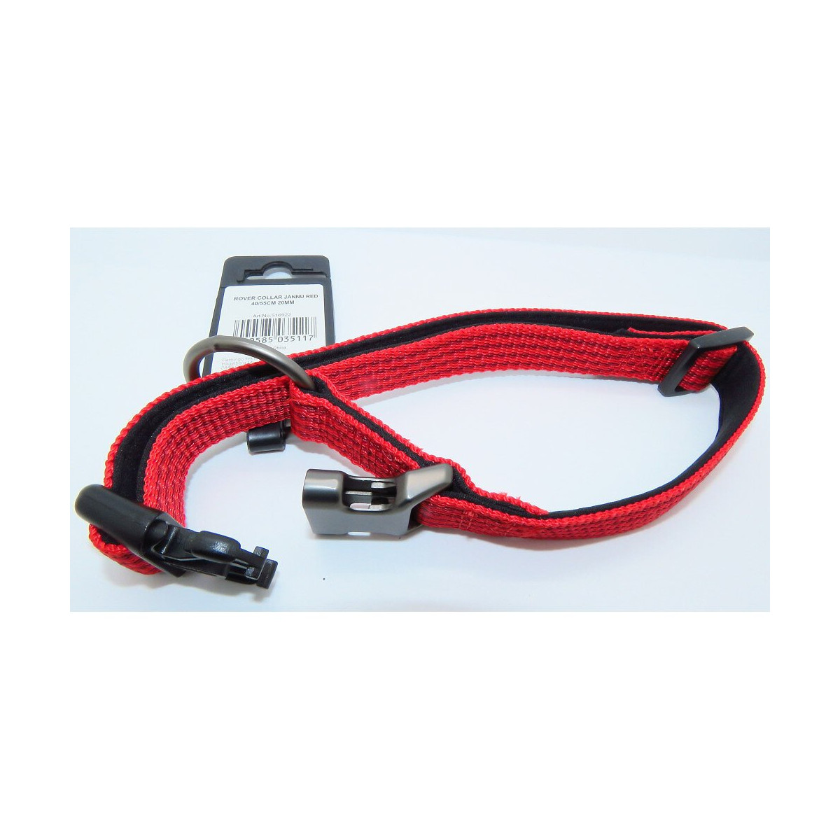 Collier Jannu réglable de 40 à 55 cm largeur 20 mm. pour chien couleur rouge. taille L système d'attache en plastique et en métal. ne peut pas blesser l'animal car il n'y a que le tissu qui touche le cou du chien. anneau en métal pour attacher la laisse. Collier Jannu réglable de 40 à 55 cm largeur 20 mm. pour chien couleur rouge. taille L système d'attache en plastique et en métal. ne peut pas blesser l'animal car il n'y a que le tissu qui touche le cou du chien. anneau en métal pour attacher la laisse. Photo non contractuelle, car il y a plusieurs vendeurs sur une même fiche produit.