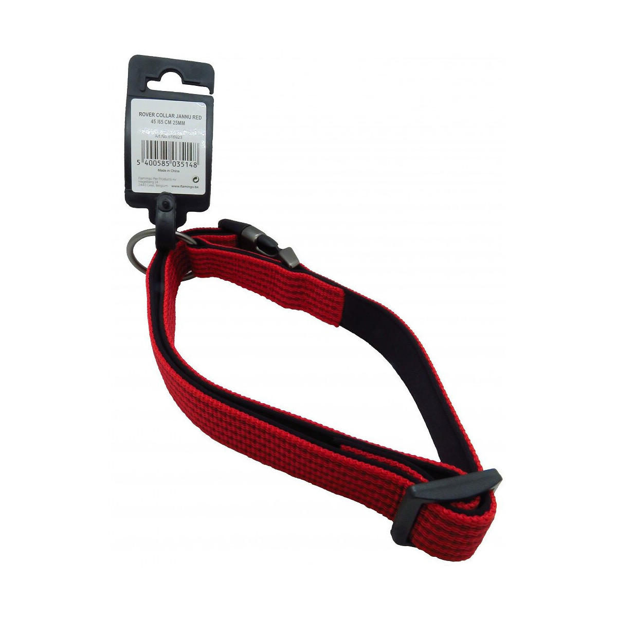 Collier Jannu réglable de 45 à 65 cm largeur 25 mm. pour chien couleur rouge. taille XL système d'attache en plastique et en métal. ne peut pas blesser l'animal car il n'y a que le tissu qui touche le cou du chien. anneau en métal pour attacher la laisse. Collier Jannu réglable de 45 à 65 cm largeur 25 mm. pour chien couleur rouge. taille XL système d'attache en plastique et en métal. ne peut pas blesser l'animal car il n'y a que le tissu qui touche le cou du chien. anneau en métal pour attacher la laisse. Photo non contractuelle, car il y a plusieurs vendeurs sur une même fiche produit.