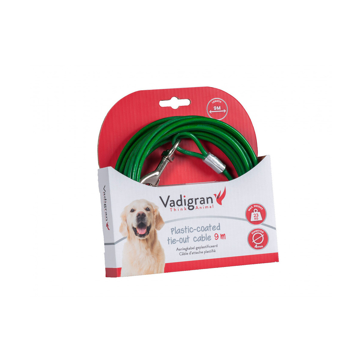 Câble d'attache gainée plastique vert 9 Mètres. Max 23 kg pour chien. Ce câble revêtu de plastique est conçu pour garder votre chien en sécurité à l'extérieur ; il existe en différentes longueurs afin que vous puissiez choisir la taille la plus adaptée à votre propriété ou à vos besoins. Avec un mousqueton à chaque extrémité, il est facile de l'accrocher à un piquet, un poteau, ou à une boucle formée autour d'un poteau ou d'un arbre ; une façon astucieuse de garder votre compagnon à proximité, tout en lui limitant l'accès à votre zone de travail en extérieur. Câble d'attache gainée plastique vert 9 Mètres. Max 23 kg pour chien. ø du câble 4 mm. Ce câble revêtu de plastique est conçu pour garder votre chien en sécurité à l'extérieur ; Avec un mousqueton à chaque extrémité, il est facile de l'accrocher à un piquet, un poteau, ou à une boucle formée autour d'un poteau ou d'un arbre ; une façon astucieuse de garder votre compagnon à proximité, tout en lui limitant l'accès à votre zone de travail en extérieur. Ce câble d'attache fera très bien le travail chaque fois que vous aurez besoin de retenir votre chien ; facile à détacher, il est portable et pratique pour les voyages. Garde les chiots à l'écart des lieux ou zones qui pourraient représenter un danger pour eux ; utile pour les petits chiens qui arrivent à passer sous les barrières, même si votre jardin est clôturée. Ce produit indispensable pour animaux domestiques existe en plusieurs couleurs et tailles. C'est un cadeau astucieux à offrir à un ami ou parent qui vient d'avoir un chien. Simplifiez-vous la vie en tant que propriétaire de chien, grâce à ce câble d'attache avec revêtement en plastique et très résistant. Utilisez-le pour garder votre chien en sécurité et pour l'empêcher de s'approcher des zones dangereuses. Ce câble d'attache vous permet de laisser votre chien sortir sans courir le risque qu'il ne s'échappe. Le câble est recouvert d'une gaine en plastique, ce qui facilite son nettoyage, et équipé d'un mousqueton à chaque extrémité, donc facile à accrocher et à décrocher. Achetez plusieurs longueurs de câbles et utilisez-les dans votre jardin. C'est l'un des câble d'attache les plus solides sur le marché. Photo non contractuelle, car il y a plusieurs vendeurs sur une même fiche produit.