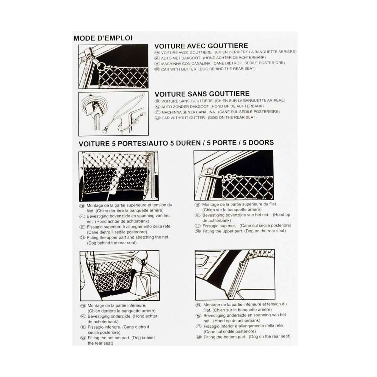 Filet pare chien auto pour transporter votre chien en voiture en toute sécurité dans le coffre ou l'isoler des places arrières. Filet avec différents types de fixations pour l'installation sur portière hayon ou gouttière de toit.Spécifications techniques