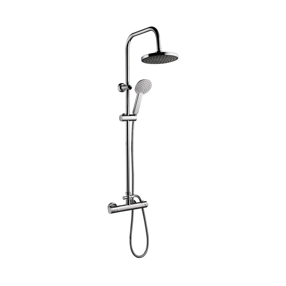 Colonne de douche chromée Tube rond hauteur 950mm Pomme de tête ronde en ABS diamètre 20cm Douchette 1 jet ronde chromée Flexible douche 150cm double agrafage Mitigeur douche mural thermostatique Sécurité anti brûlure 38°CDébit tête céramique 1/2 tour Entraxe 150mm double sortie Inverseur sur le tube Support de douchette ajustable Fourni avec raccords excentriques et rosacesSpécifications techniques