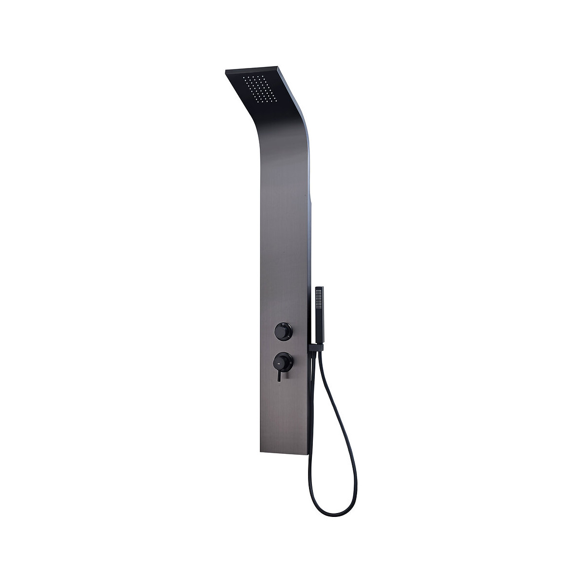 Panneau en inox gun métal hauteur 1450mm Extra fin épaisseur 45mm Surface anti-trace Mitigeur mécanique cartouche céramique 40mm Pomme de tête intégrée 17x8cm Douchette noire en ABS 1 jet Flexible de douchette en PVC noir 150cmSpécifications techniques