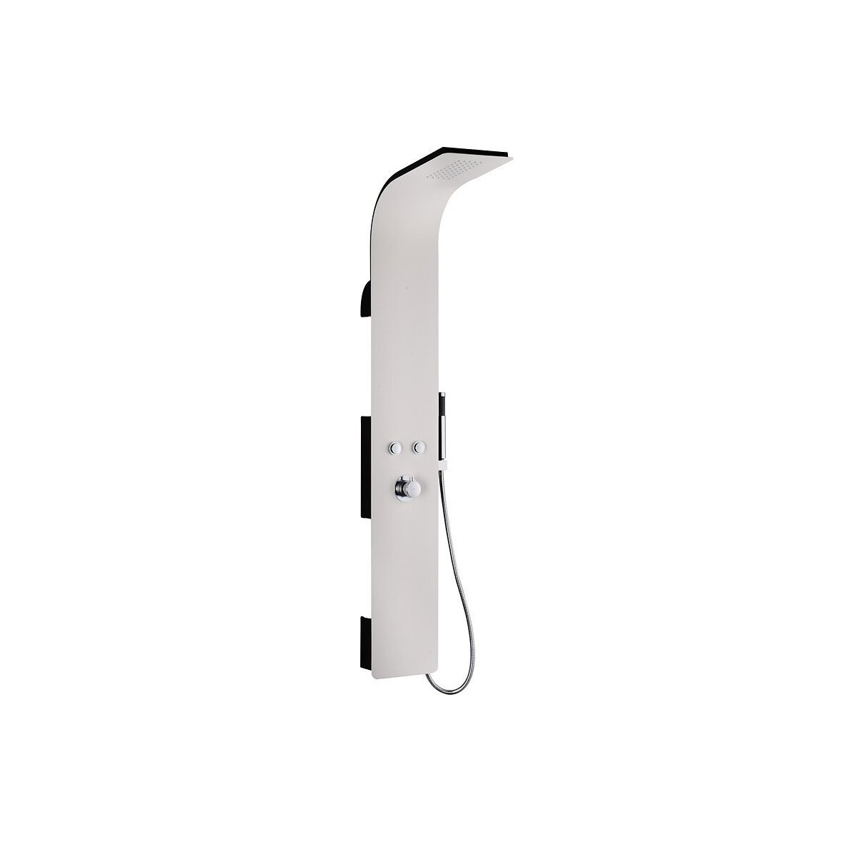 Panneau en alu blanc hauteur 1500mm Mitigeur mécanique cartouche céramique 40mm Pomme de tête intégrée 25x10cm Douchette chromée en ABS 1 jet Flexible de douchette en PVC gris 150cm Etagères porte flacons au dos du panneau accessibles sur le côtéSpécifications techniques
