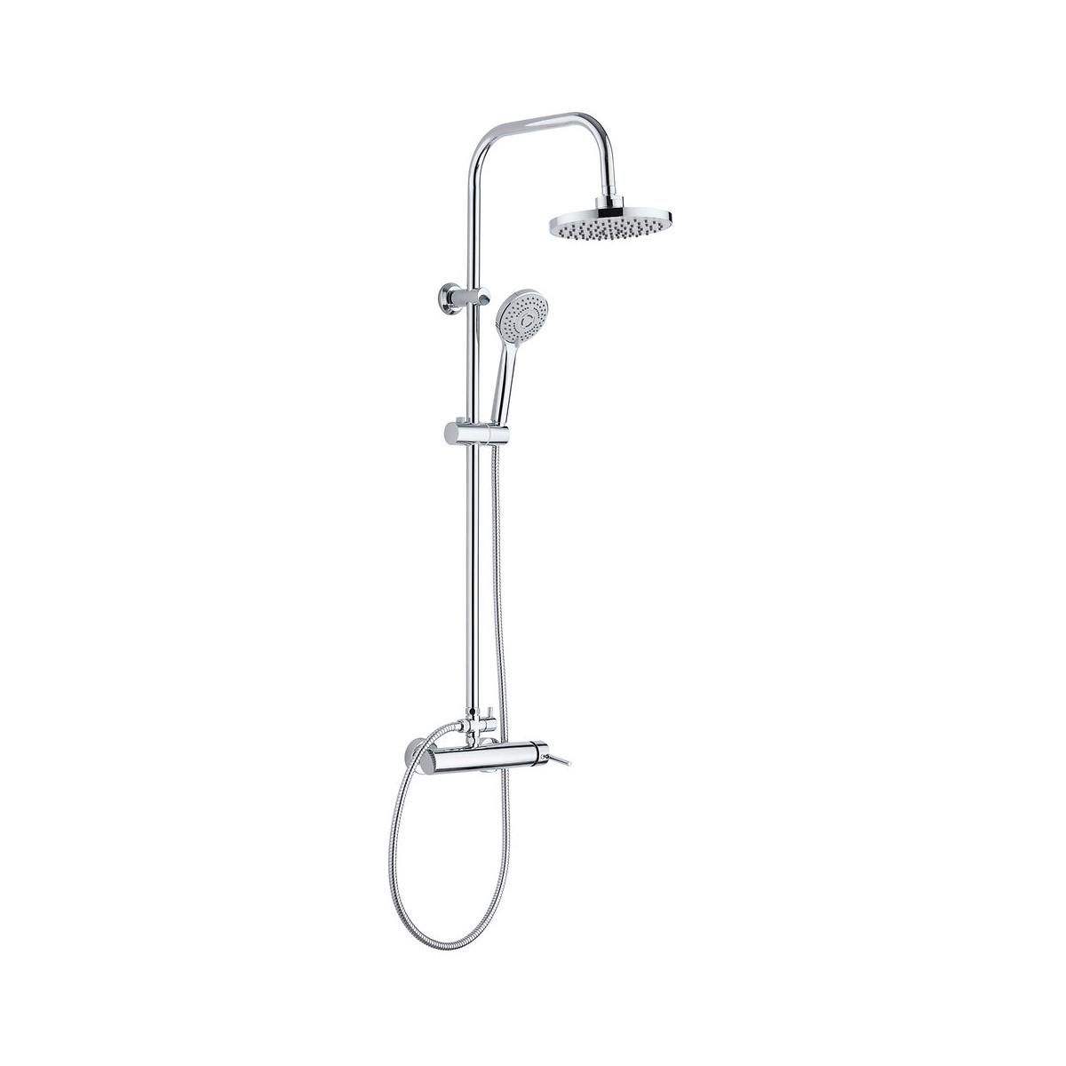 * Tête de douche : - orientable - Ø 200 mm - matière : ABS - anticalcaire : picots souples * Bras de douche : - Ø 22 mm - hauteur : 110 cm - matière : inox chromé - fixation murale : embase ABS mobile - support douchette : coulissant et inclinable - inverseur : laiton et disques en céramique * Douchette : - nombre de jets : 3 (pluie, massage, tonique) - Ø 97 mm - matière : ABS - anticalcaire : picots souples * Flexible : - inox chromé 1,50m - double agrafage pour une solidité renforcée * Robinetterie : - mitigeur à cartouche céramique Ø 35 mm - entraxe de pose : 150 mmSpécifications techniques