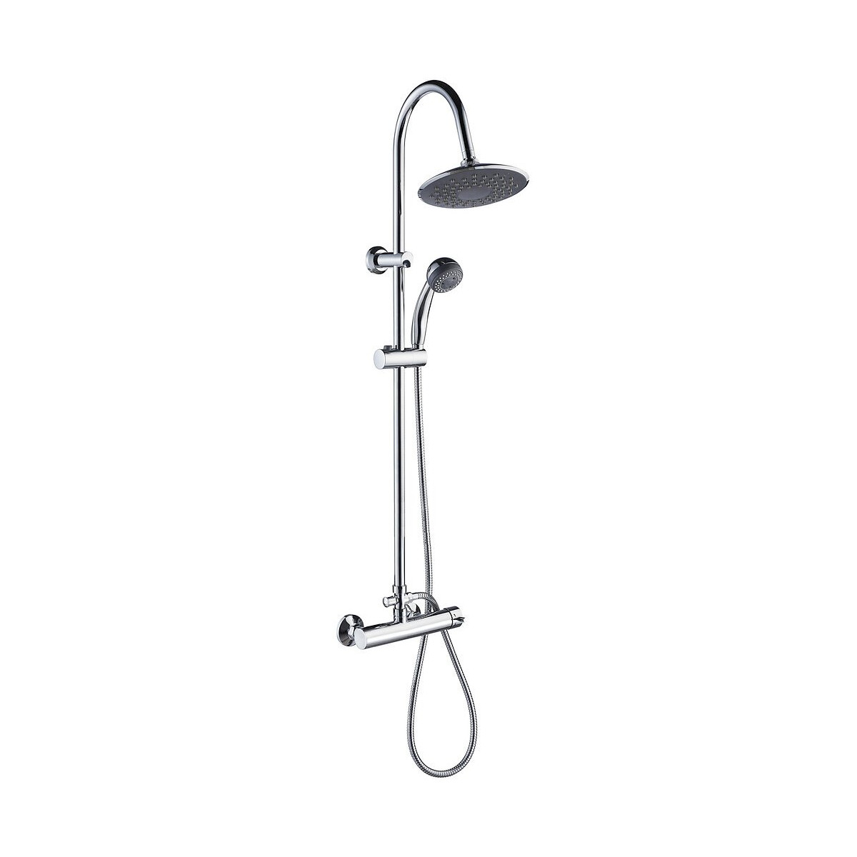 Colonne de douche chromée Tube rond hauteur 980mm Pomme de tête ronde diamètre 20cm en ABS Douchette 3 jets chromée Flexible douche 150cm double agrafage Mitigeur douche mécanique cartouche 35mmEntraxe 150mm double sortie Inverseur sur le tube Support de douchette ajustable Fourni avec raccords excentriques et rosacesSpécifications techniques