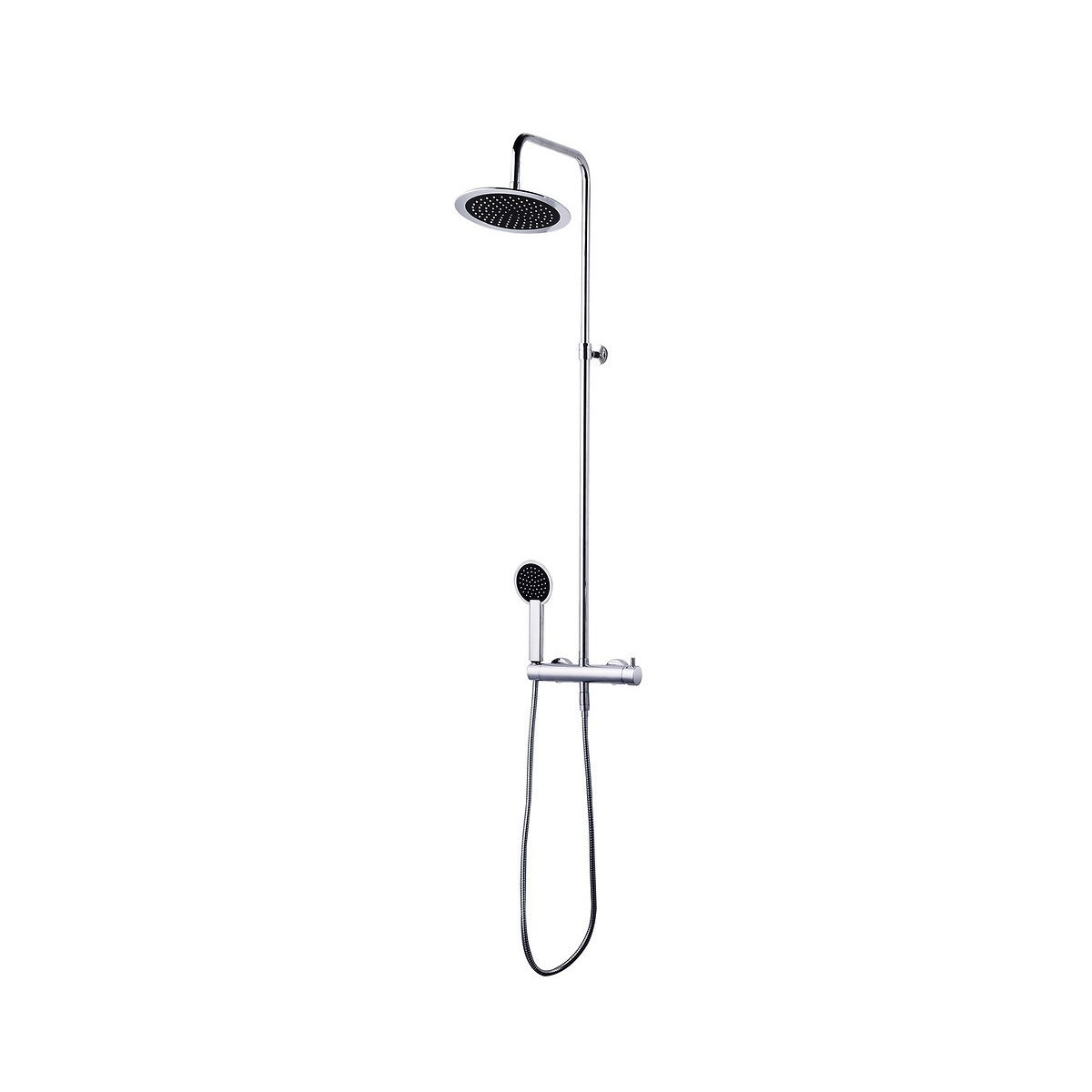 Colonne de douche ronde avec mitigeur : Robinetterie mécanique - Mitigeur laiton - Cartouche ceramique dia 35 mm -Tête de douche : diamètre : 23cm - matière/coloris : ABS Noir Finition chrome avec face noire et picot gris clair - Barre de douche : matière/coloris : inox chromé - diamètre :19mm & 22mm - barre carrée télescopique de 77cm à 1,17m - fixation murale en metal - Douchette : diamètre : 11cm - nombre de jets : 1 - meme finition pomme - support douchette en ABS - Flexible : 1,5m en inox double agrafage -Inverseur integre sous le mitigeur en 1/2