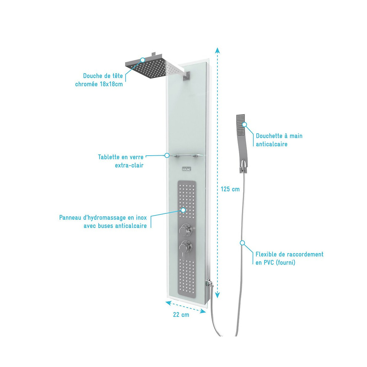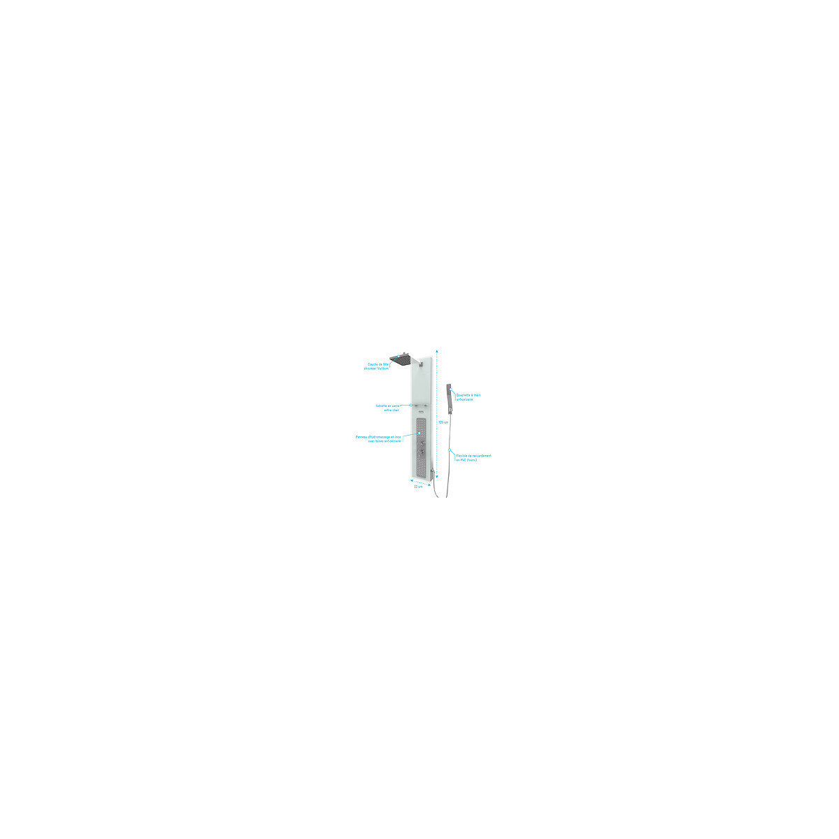 Caractéristiques techniques Colonne de douche en verre peint en blanc Douche de tête chromée Douchette à main anticalcaire Panneau d’hydromassage inox Mitigeur mécanique Tablette en verre extra-clair Système de fixation murale Livrée avec flexibles de raccordement Dimensions 22x125cm Référence: COL043 Garantie 2 ans pièces uniquement. Cocorico ! MyShowerRoom est une entreprise Française et toute la conception de nos produits est également Française. Ce qui est un véritable plus pour être au plus près de ses clients et avoir une meilleure connaissance de leurs attentes. Qui sommes nous L’HISTOIRE DE MYSHOWERROOM Nous avons créé MyShowerRoom en 2003 avec l’ambition de démocratiser le design et l’innovation dans la salle de bain pour faire de cette pièce un lieu à part entière, un véritable lieu d’histoires à vivre pour toute la famille. Nos cabines de douche et meubles de salle de bain dans l’ère du temps à des tarifs très accessibles. Nos nombreux brevets garantissent l’originalité de notre gamme de cabines de douches. Et nos ingénieurs mettent en œuvre tout leur savoir-faire et toutes les technologies innovantes au service d’une simplicité d’installation et d’utilisation incomparable pour tous. ÊTRE BIENVEILLANT AVEC NOS CLIENTS Notre service client a un objectif : rendre nos clients heureux. Pour cela nous veillons à répondre dans les 24h aux demandes clients. Mais aussi de toujours apporter une solution et entière satisfaction à nos clients. CONSTRUIRE DES PRODUITS TOUJOURS PLUS PERFORMANTS Nos ingénieurs, ainsi que nos équipes terrain consacrent tous leurs efforts à créer des produits adaptés à vos besoins, et toujours plus innovants grâce à nos technologies. Notre objectif est d’être votre unique interlocuteur pour tous vos projets de salle de bain. CONCRÉTISER LES RÊVES DE CHACUN Un projet de salle de bain ? Nous le réalisons ! Lieu de détente et de relaxation par excellence, la salle de bain est une des pièces maîtresse de la maison. Chez MyShowerRoom, nous mettons tout en oeuvre afin que ce rêve devienne réalité. PROPOSER UNE GAMME COMPLÈTE DE PRODUITS Nous vous proposons grâce à notre boutique en ligne une gamme complète de produits Made in MyShowerRoom pour équiper, et accessoiriser votre salle de bain. Un catalogue que nous renouvelons régulièrement avec les dernières technologies MyShowerRoom. APPORTER UNE EXPERTISE HUMAINE Parce que l’humain passe avant tout, nous travaillons avec les meilleurs experts. La satisfaction de nos clients est notre seule et unique priorité. Chaque problème a une solution, et c’est dans cette optique que nous avons mis en place un chat pour échanger directement avec nos équipes. NOTRE CENTRE LOGISTIQUE 11 000 m² d’entrepôt 7000 palettes en stock 1 800 colis traités par jour Plus de 260 préparations de commandes quotidiennes 12 quais de chargement/déchargement CONSEILS & VENTES Une équipe disponible 5 jours sur 7 pour vous accompagner dans vos achats. LIVRAISON GRATUITE Pour toute commande sur le site MyShowerRoom, la livraison est gratuite dans toute la France. UNE GARANTIE DE QUALITÉ Grâce à nos produits brevetés vous bénéficiez de produits uniques. Référence produit: COL043 Retrouvez plus d'informations produit et des conseils de montage sur le site Aurlane. Remarques importantes: Ces colis sont volumineux, la livraison est effectuée par transporteur spécialisé en bas de chez vous. Les chauffeurs ne sont pas habilités à porter la marchandise, mais uniquement à la décharger. Pas de livraison à l'étage. L'adresse de livraison doit être accessible en camion poids lourd. Dans le cas contraire la marchandise sera mise à disposition au dépôt le plus proche (distance non garantie). Les rendez-vous sont gérés directement par les transporteurs. Attention à bien contrôler la marchandise à réception pour éviter tous litiges.