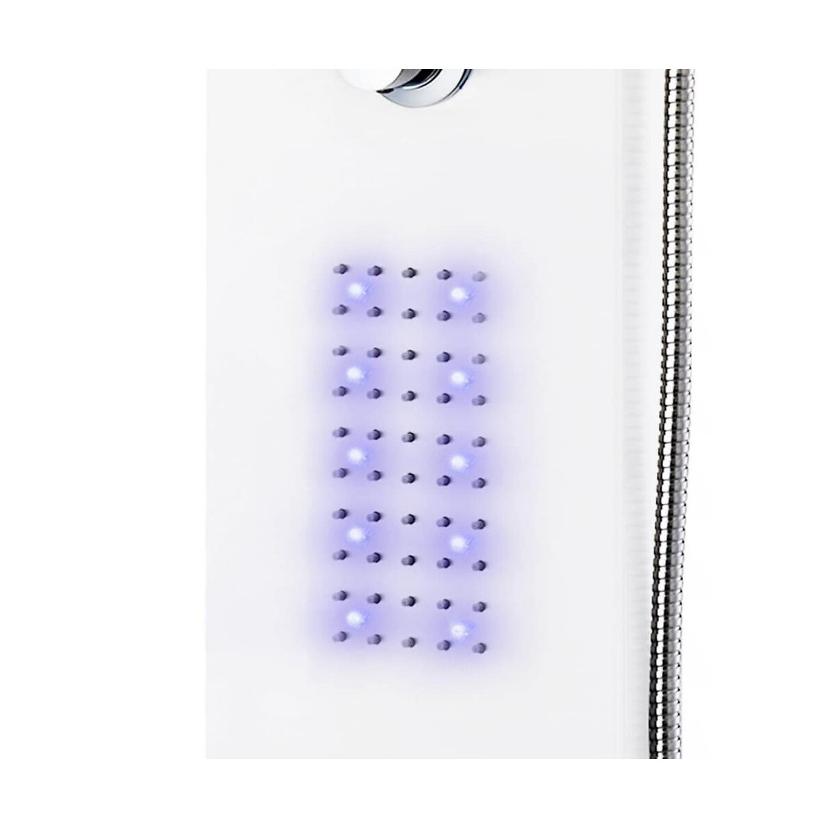Ce système de panneaux de douche multifonctionnel a un design élégant et fera un excellent accessoire à votre salle de bain. La tour de douche est en aluminium durable et résistant à la rouille. Il est équipé de 30 LED résistants à l'eau dans la pomme de douche à l'effet de pluie et de jets de massage corporel pour fournir un éclairage d'ambiance. Il existe quatre modes de douche : pluie, cascade, jet de massage et douche à main, qui peuvent être facilement sélectionnés. Les buses en silicone sont résistantes à la formation de calcaire. Plongez dans une expérience de douche vraiment relaxante et appréciez le style moderne de ce système de panneaux de douche magnifiquement conçu. L'assemblage est facile. La livraison comprend tous les accessoires de montage. Couleur : blanc Matériau : aluminium Dimensions hors tout : 20 x 44 x 130 cm (l x P x H) Dimensions de la pomme de douche à main : 20 x 3 cm (L x l) Dimensions des jets de massage (chaque ensemble) : 20,5 x 10,8 cm (L x l) Longueur du tuyau flexible en acier inoxydable : 1,5 m Longueur du raccordement de plomberie : 50 cm Avec 45 jets pour la pomme de douche à l'effet de pluie et 150 jets pour le jet de massage Fonctions : douche à l'effet de pluie, cascade, 2 jeux de jets de massage, douche à main Contrôle facile de la température au moyen du bouton du thermostat : 20-50 ° C 30 lumières LED : 10 sur la pomme de douche à l'effet de pluie et 10 sur chaque ensemble de jets de massage Les lumières LED ont besoin de piles (piles non incluses) Pomme de douche à main et boutons chromés Facile à assembler La livraison comprend tous les accessoires de montage