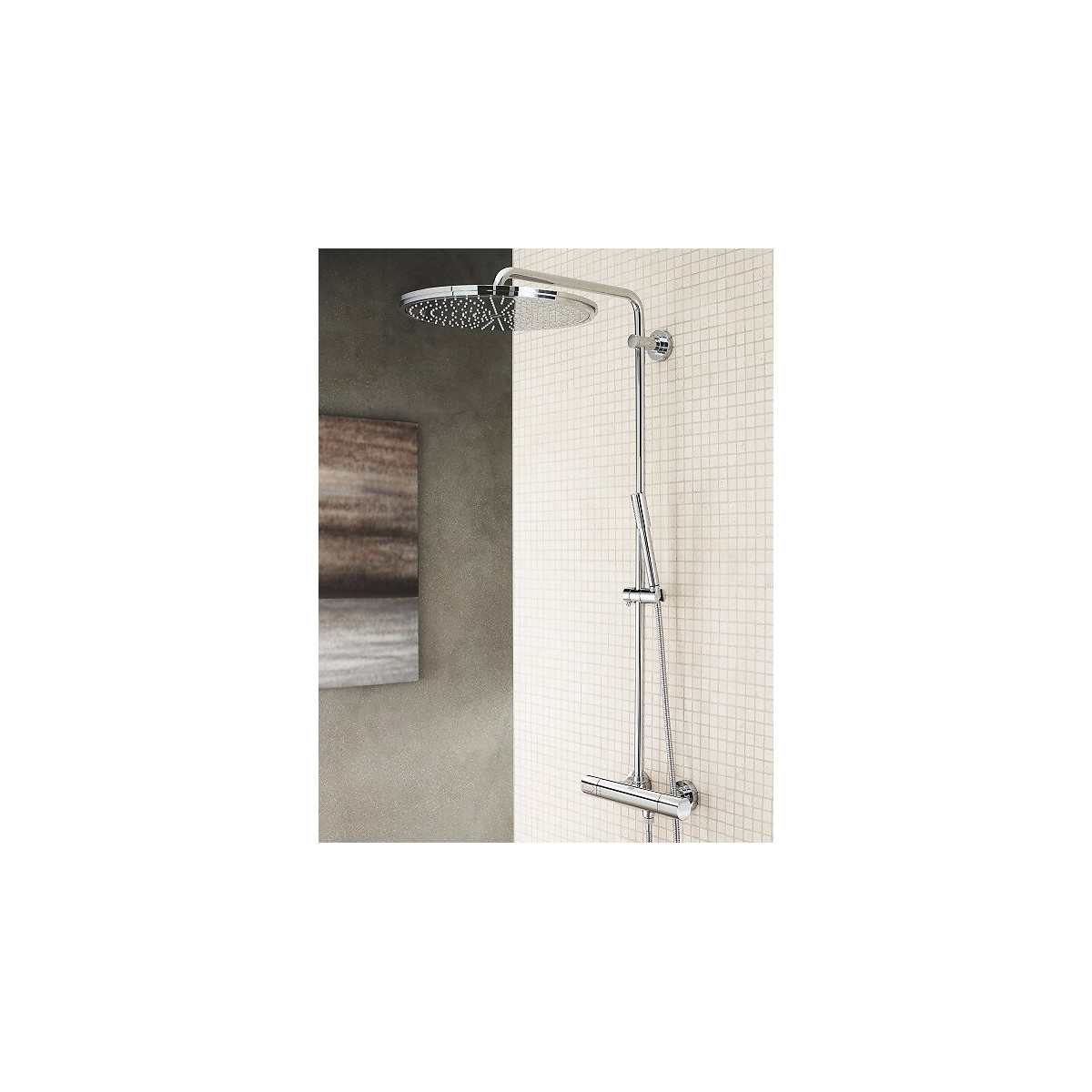 Caractéristiques : Avec rotule, angle de rotation ? 20 Douchette à main Sena (28 034 000) 1 jet Réglable du curseur en hauteur Flexible 1750mm (28025) Grohe TurboStat Régulation thermostatique quasiinstantanée Grohe SafeStop butée à 38 C pour éviter les brûlures de peau avec une température trop élévée Grohe SafeStop Plus limiteur de température en option à 43 C inclus Grohe Ecojoy, économies d eau de 50% pour chaque utilisation. Grohe CoolTouch Minimise les risques de brûlures, le mitigeur ne surchauffe pas DreamSpray jet parfaitement uniforme dans toutes les buses Grohe StarLight chrome éclatant et durable sur toute la surface Procédé anti-calcaire et anti corosif SpeedClean Inner WaterGuide, longévité maximale Ref produit : 27174001 Composé : Bras de douche de 450 mm orientable horizontalement Mitigeur thermostatique incluant fonction inverseur 2 sorties Douche de tête Rainshower Cosmopolitan 400 (28 778 000) 1 jet