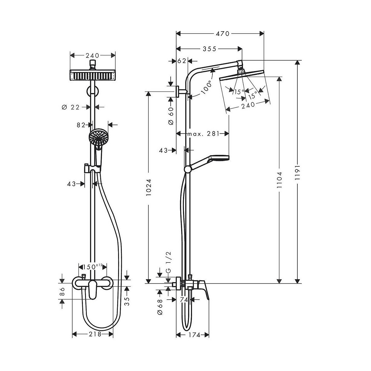 Points forts Large douche de tête pour un confort optimal Douchette à main 2 jets Mécanisme fiable et matériaux de haute qualité QuickClean : élimination facile du calcaire Garantie : 5 ans Caractéristiques techniques de la colonne douche Hansgrohe Crometta E Showerpipe 240 Composé de : Douche de tête Hansgrohe Crometta E 240 (Ref : 27284000) Douchette à main Hansgrohe Crometta Vario ( Ref : 26330400) Flexible douche Hansgrohe Isiflex (Ref : 28276000) Finition : chrome Longueur du bras de douche: 350 mm Limiteur d’eau chaude réglable Type d installation : installation murale apparente Entraxe 150 mm ? 12 mm Cartouche céramique Tube recoupable par le bas Référence : 27284000 Caractéristiques techniques de la douche de tête Hansgrohe Crometta E 240 Design contemporain Jet Rain Dimensions de la douche de tête : 240 x 240 mm Douche de tête orientable grâce à une rotule Débit du jet Rain (sous 3 bars de pression): 18 L/min Matériau du disque de jet : synthétique Type d installation : plafond ou mur Référence : 26726000 Caractéristiques techniques de la douchette à main Hansgrohe Crometta Vario Diamètre de la douchette à main : 100 mm 2 jets : jet Rain, jet IntenseRain Changement de jet en tournant l extrémité de la douchette Débit: 14 L/min sous 3 bars de pression Filtre nettoyable Convient au chauffe-eau instantané Référence : 26330400 Caractéristiques techniques du flexible de douche Hansgrohe Isiflex Flexible de douche de haute qualité Revêtement synthétique facile à nettoyer Ecrou tournant côté douchette évitant la torsion du flexible Anti-pliure Référence : 28276000