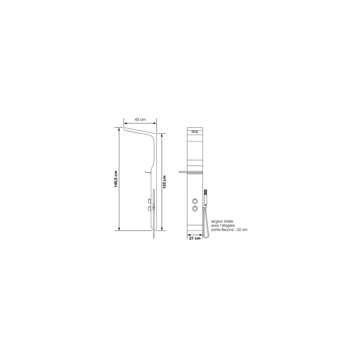 Caractéristiques de la colonne douche Aquamoon Kinedo Disponible en 2 coloris : Blanc ou Noir Type de pose : Installation murale Matériau utilisé : ABS - Matière très résistante aux chocs et aux rayures Mitigeur thermostatique encastré Flexibles d alimentation Douchette à main en laiton Flexible anti-torsion pour un confort optimal Ciel de pluie avec buses silicones anti-calcaire pour une hygiène parfaite et une économie d eau Pratique : étagère porte-savons en chrome Longueur du ciel de pluie : 45 cm Longueur de la colonne de douche : 140,5 cm Largeur de la colonne douche : 21 cm Garantie : 2 ans Référence colonne douche blanche : CD340B Référence colonne douche noire : CD340N