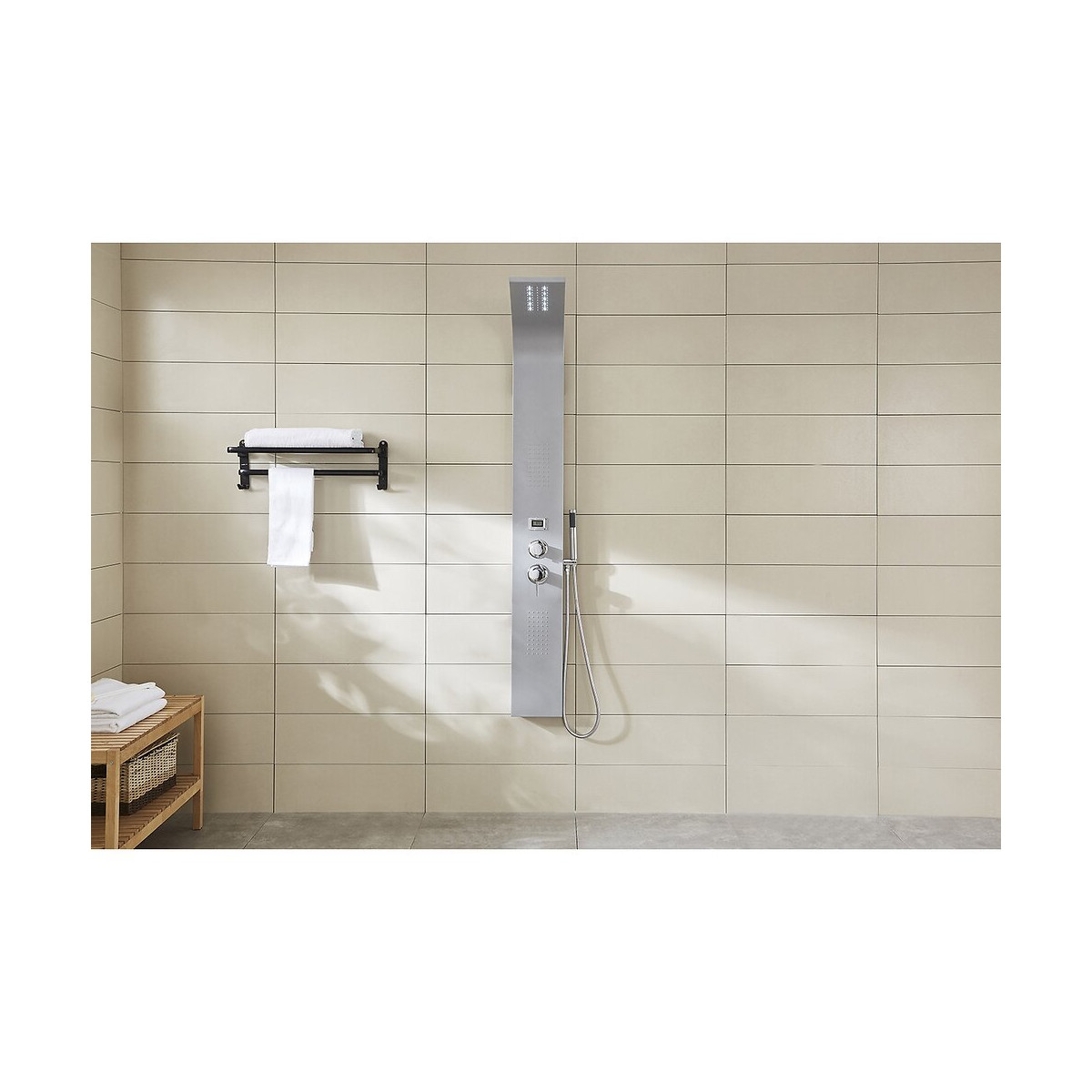 Colonne de douche au design innovant, même futuriste, qui vous permettra de vous détendre et de profiter de ce moment agréable grâce à son éclairage par LED et ses jets de massage. Caractéristiques techniques : • 2 Mitigeurs • Pomme haute : pommeau grand diamètre avec fonction pluie tropicale et différentes zones d’une cinquantaine de micro-jets pour un massage complet et agréable• Pommeau à main chromée• Eclairage par LED • Panneau : Aluminium peint• Flexibles fournis : 1,5 mètres• Affichage de la température• Dimensions : L18 x H150 cm Installation facile. Garantie 2 ans * Livraison pas de porte *Photo non contractuelle, voir descriptif produit. Ce produit répond aux dernières normes en vigueur au niveau français et européen, notamment l'ACS, attestation de conformité sanitaire, et vous garantit de nombreuses années d'utilisation en toute sécurité.
