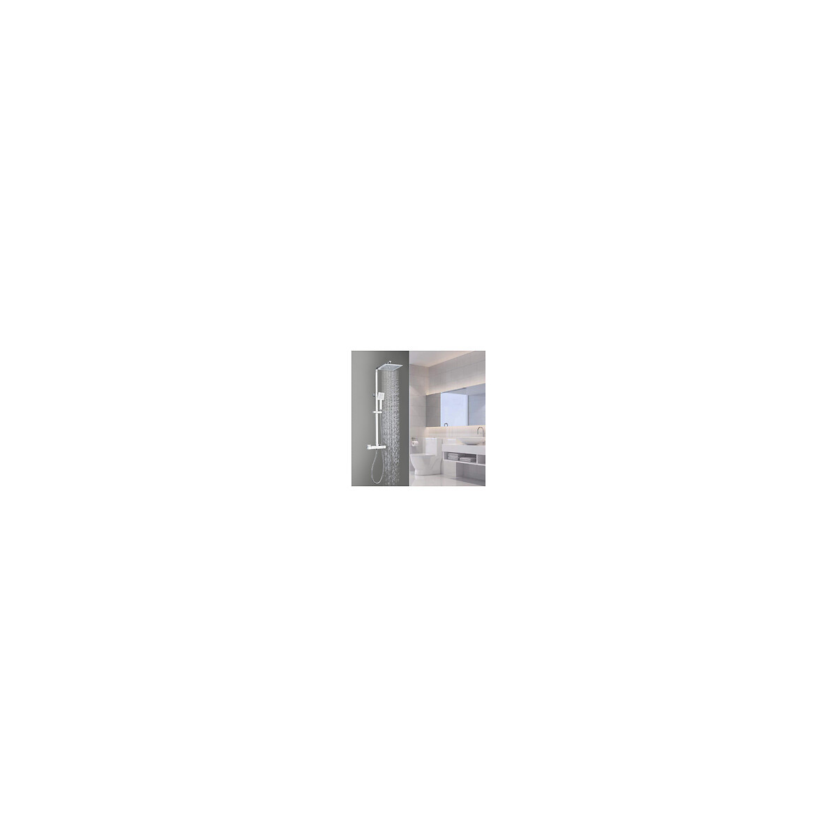 DESIGN ET QUALITÉ Couleur : Chrome. Finition produit : Inox. Type de produit : Combiné de douche Thermostatique. Corps du robinet : Carrée. Tube : Carrée. Pomme de tête : Carrée en ABS. Douchette : Carrée en ABS. Support de douchette : En ABS - réglable en hauteur. Types de jets : Pomme de tête Zénithale / Douchette 1 jets. Inverseur : Oui (dans la poignée). Entraxe : 150mm. Flexible : 1.5m double aggraphage. Mécanisme : Cartouche thermostatique. Compatibilité : Cumulus ou production d'eau chaude instantanée : minimum 12L/min. Raccords excentriques et rosaces : fournis. SÉCURITÉ Sécurité anti-brûlure : 38°. DIMENSIONS Hauteur totale : Ajustable de 720-1200 mm. Dimensions pomme de tête : 225x225 mm. Largeur sortie d'eau / axe du corps : 370 mm. Diamètre tube : 26x14 mm. Normes : ACS. Garantie : 2 ans.