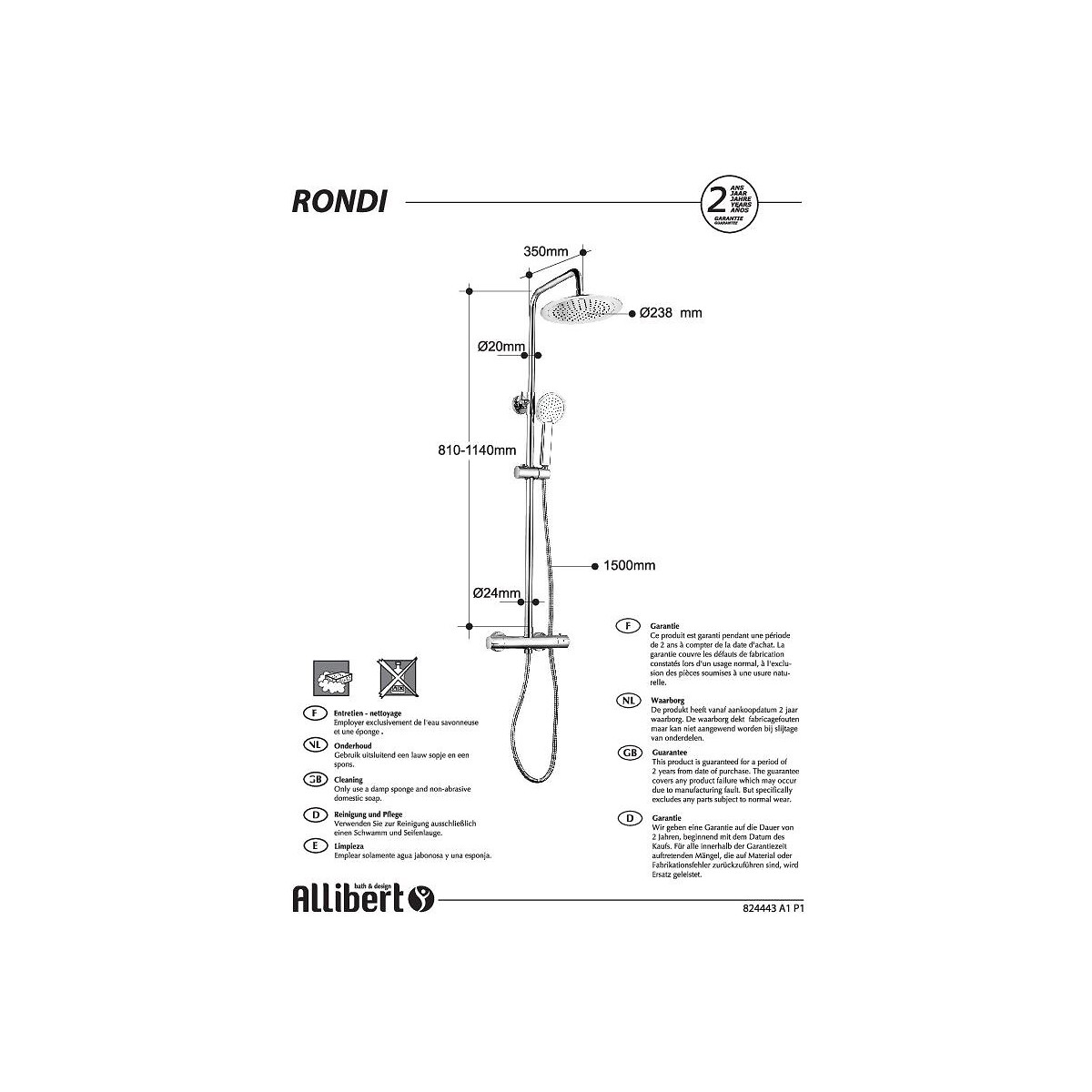 Colonne de douche RONDI avec pommeau de tête jet pluie et douchette à main. Caractéristiques : Pommeau de tête diamètre 23,8 cm en ABS chromé 1 jet pluie Douchette 1 jets en ABS chromé Anticalcaire Barre de douche en inox chromé brillant ajustable en hauteur entre 82 et 112 cm Robinet thermostatique avec déviateur pour jet à main Flexible en inox chromé 1,50 m Installation façade uniquement Dimensions : 28,2 x 112 x 55 cmSpécifications techniques