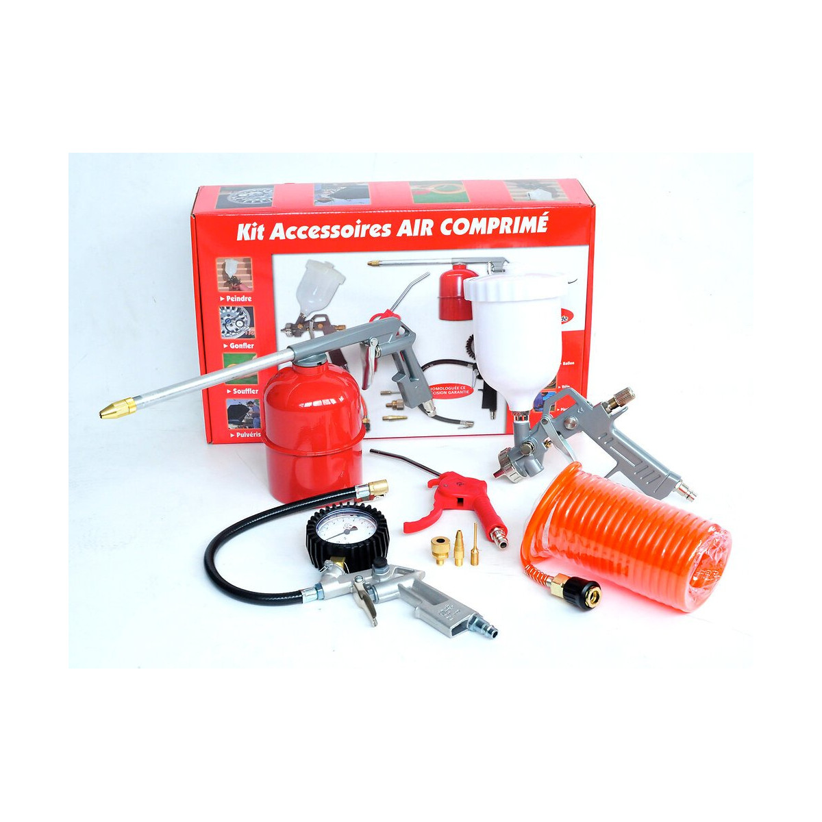 Un kit complet d'accessoires à air comprimé. Soufflette. Poignée de gonflage métal homologuée CE. Pulvérisateur. Pistolet de peinture. Tuyau spirale 5m3. Embouts de gonflage.Spécifications techniques