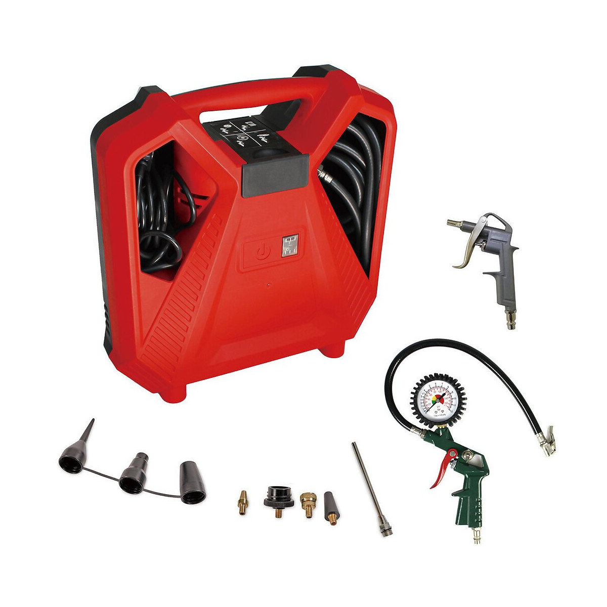 Compresseur portatif avec pistolet soufflant et manomètre. Idéal pour gonfler des pneus de voiture ou de vélo, des jouets en caoutchouc, des matelas pneumatiques et des ballons de football.