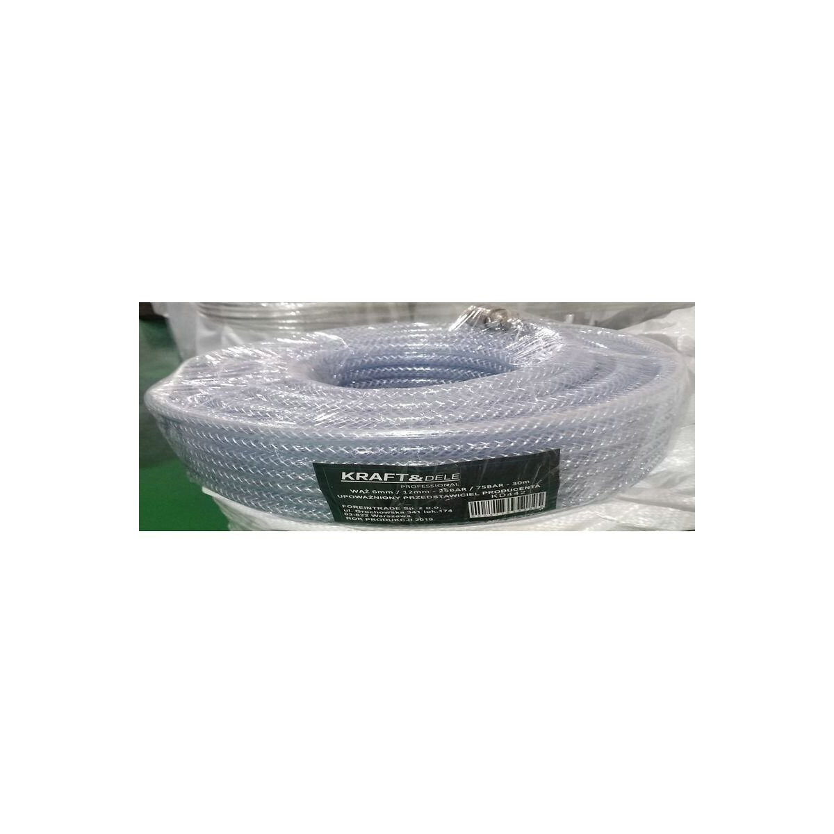 Le tuyau est fait en PVC flexible et est renforcé par un filet en polyester. Cette composition du produit assure un flux étanche d'air et de liquides à des pressions statiques élevées. Le tuyau peut être utilisé comme accessoire pour les compresseurs, les outils pneumatiques, les nettoyeurs haute pression et autres équipements nécessitant une résistance à la haute pression; CARACTÉRISTIQUES TECHNIQUES: Tuyau renforcé; Longueur : 30 m; Diamètre extérieur : 12 mm; Diamètre intérieur : 6 mm; Poids : 3.52 kg