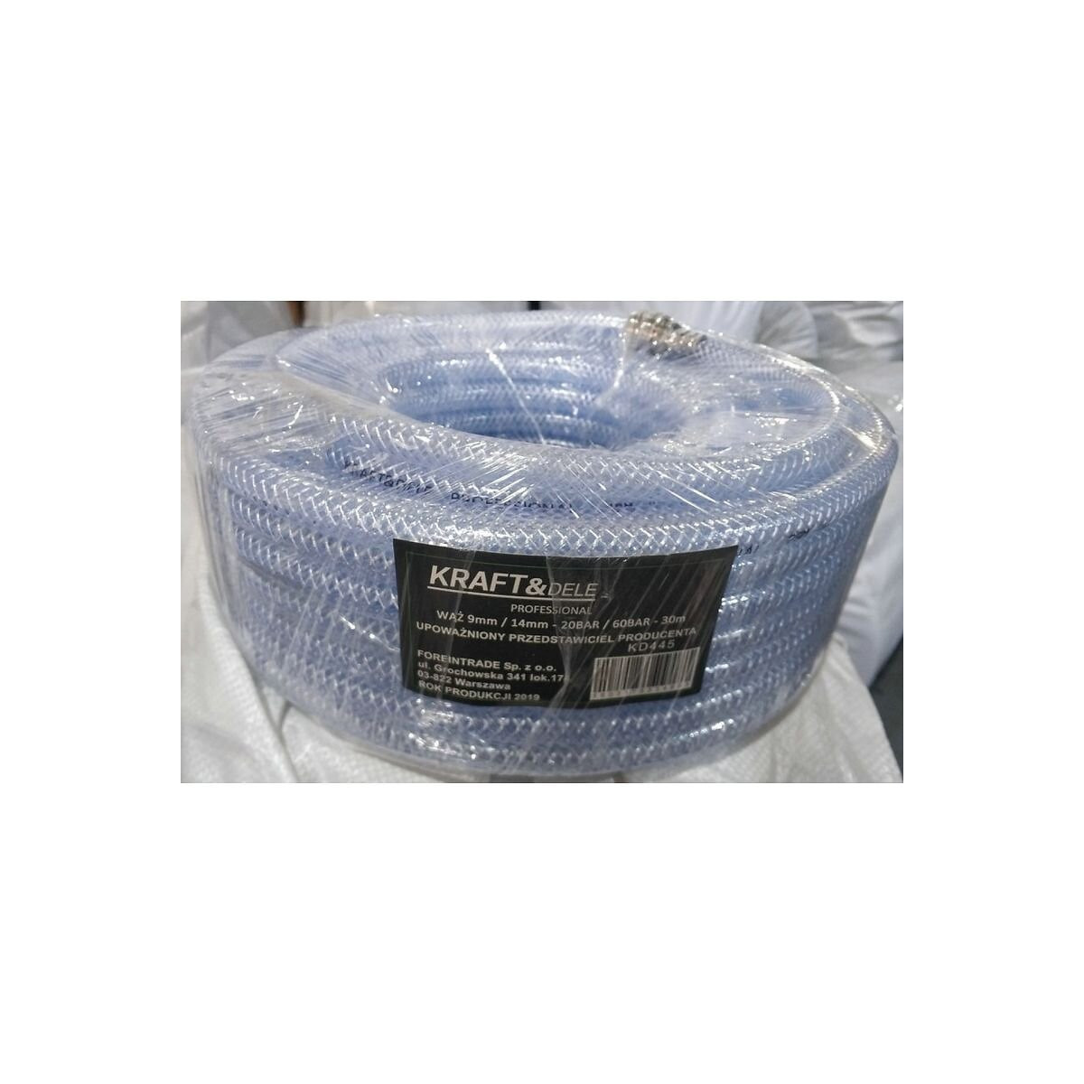 Le tuyau est fait en PVC flexible et est renforcé par un filet en polyester. Cette composition du produit assure un flux étanche d'air et de liquides à des pressions statiques élevées. Le tuyau peut être utilisé comme accessoire pour les compresseurs, les outils pneumatiques, les nettoyeurs haute pression et autres équipements nécessitant une résistance à la haute pression; CARACTÉRISTIQUES TECHNIQUES: Tuyau renforcé; Longueur : 30 m; Diamètre extérieur : 14 mm; Diamètre intérieur : 9 mm; Poids : 3.66 kgSpécifications techniques