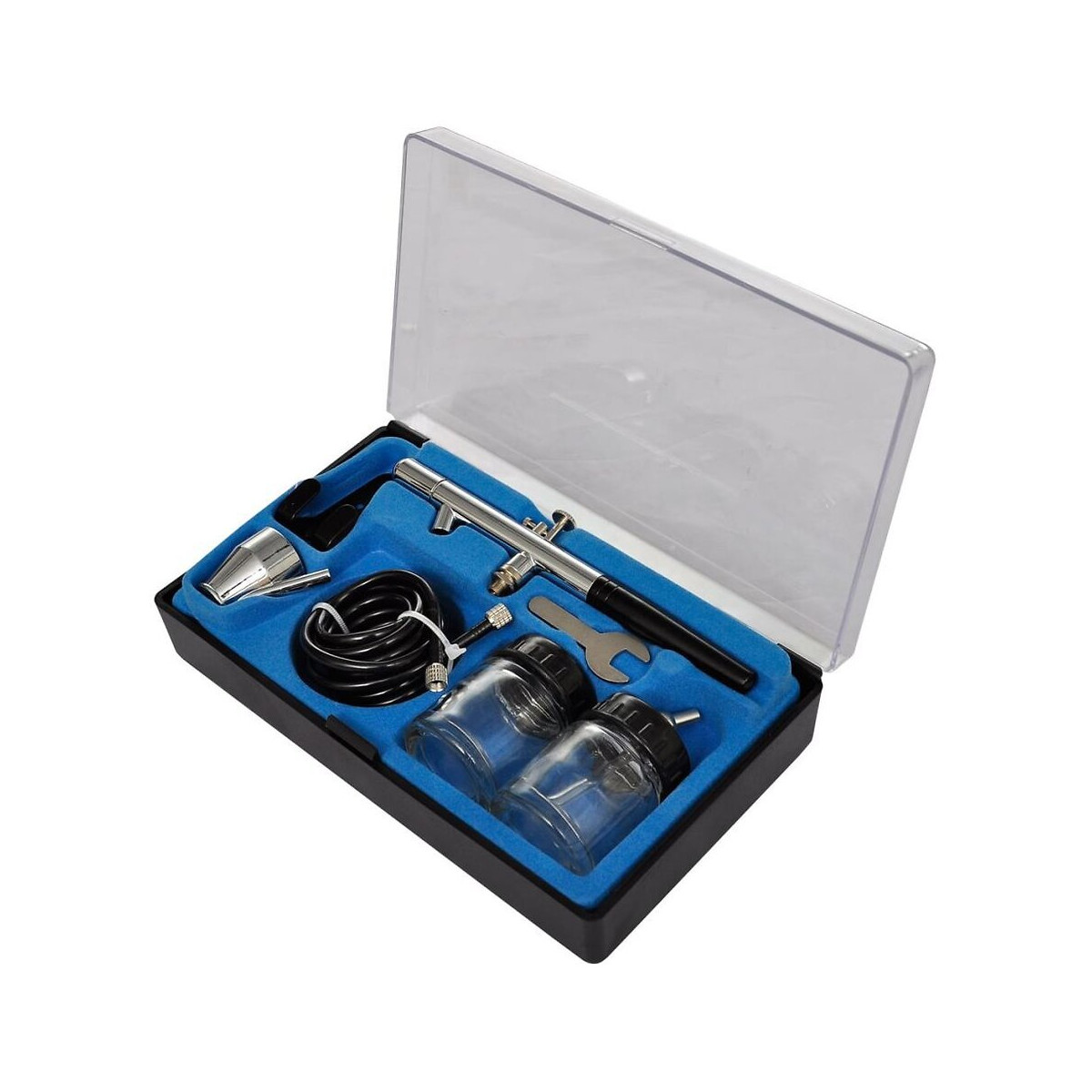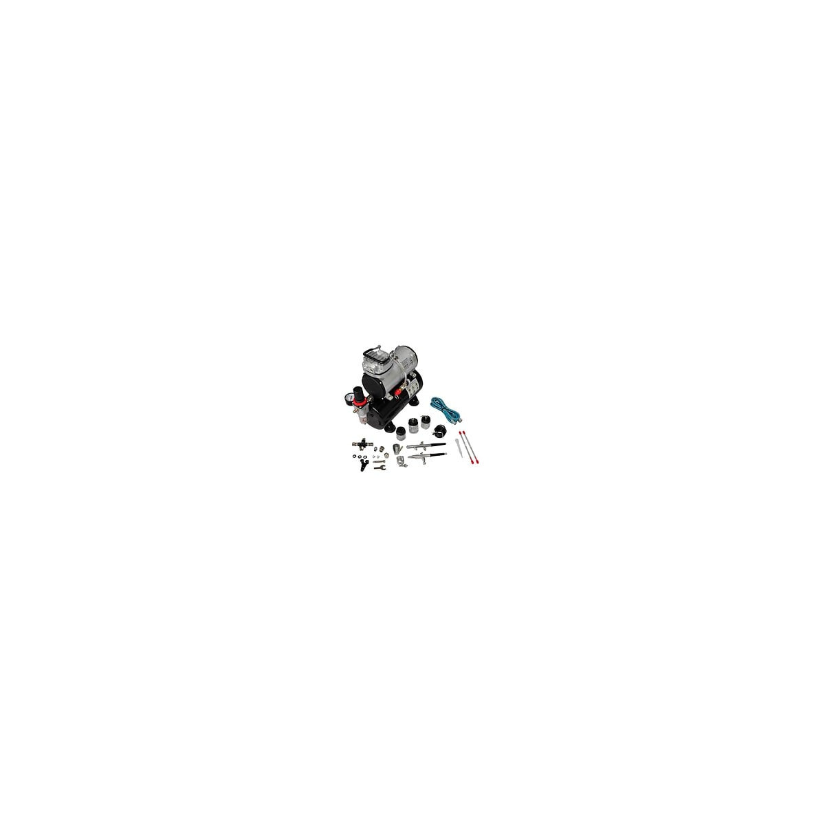 L'ensemble de l'aérographe professionnel se compose d'un mini compresseur, deux pistolets aérographe et d'autres accessoires: 1. Mini compresseur à piston 2. Pistolet à double-fonction-8-pièce 3. Pistolet avec double-fonction-11-pièces 4. Raccord de tuyau 3 voies comprend 2 bouchons Mini compresseur à piston Type: compresseur à piston cylindre avec réservoir d'air Puissance: 1/6 HP Vitesse : 1450 t/min Débit d'air : 20 - 23 l/min Longueur de fil: 1,8 m Entrée de compresseur: 1/8 " Niveau de bruit: 47 db Ajustement de réglage: Marche: 3.0bar Arrêt: 4.0bar Pression max: 4 Bar Volume du réservoir: 3,0 L Poids: 5,2 kg Dimension: 310 x 150 x 310 mm Pistolet à double-fonction-8-pièces Pression de service: 1 - 3,5 Bar Diamètre de la buse: 0,35 mm Longeur : 146 mm Filet de raccordement: M 5 x 0,5 Pistolet à double-fonction-11-pièces Pression de service: 15 - 50 Psi/1 - 3,5 Bar Diamètre de la buse: 0,2 mm, 0,3 mm and 0,5 mm Adaptateur: 1/ 8 " Longeur: 158 mm Capacité de fiole en verre: 22 ml Longeur : 1,9 m Raccord de tuyau 3 voies comprend 2 bouchons Matériel: Plastique Adaptateur: 1 /8 "