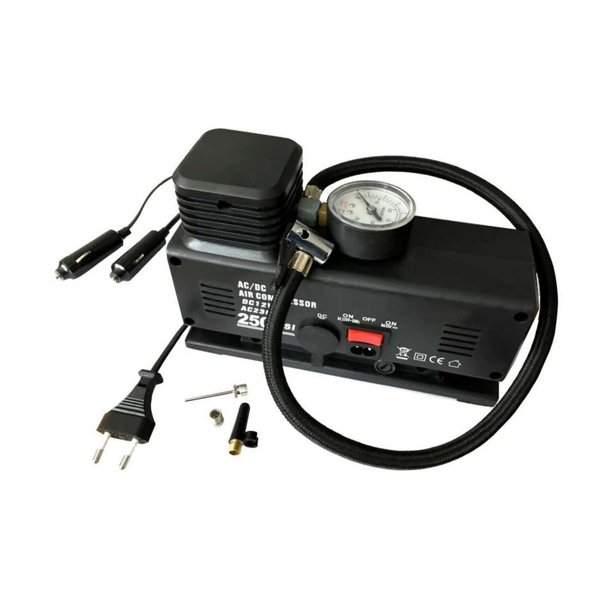 Informations produit: Compresseur 12-230 volts, 250 PSI avec manomètre Branchement allume cigare 12V et secteur 230V 17 bars/ 250 PSI Débit d'air: 15 litres/minute Durée d'utilisation max en continu: 10 minutesSpécifications techniques