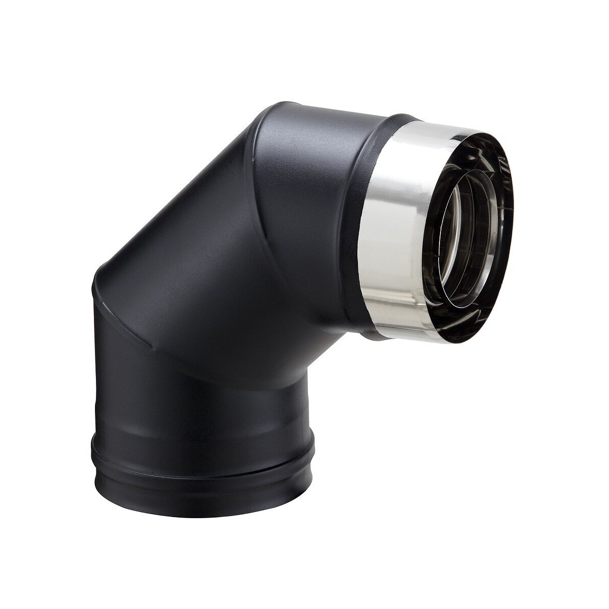 Coude à 90° noir avec collier de jonction permettant la réalisation de dévoiement dans le conduit de fumée. Étanchéité mécanique obtenue par un emboîtement cône sur cône. Le ,PGI ,s'intègre en neuf comme en rénovation, dans un habitat où l'économie d'énergie et la valorisation thermique sont les objectifs prioritaires. Le système VENTINOX a été développé pour apporter une réponse performante à la technologie spécifique des appareils à granulés de bois et des poêles. Sa technologie concentrique permet l'amenée d'air comburant par le conduit et de préserver l'étanchéité de la maison. Le préchauffage de l'air améliore la combustion, une augmentation moyenne de 10% du rendement a été démontrée sur les poêles à granulés. VENTINOX PGI (poêle granulé intelligent) est le premier système titulaire d'un avis technique spécialement adapté à l'évacuation des fumées des poêles à granulés. Testé par le laboratoire CERIC en collaboration avec la plupart des fabricants d'appareils, il est préconisé par l'ensemble des grands industriels.Spécifications techniques