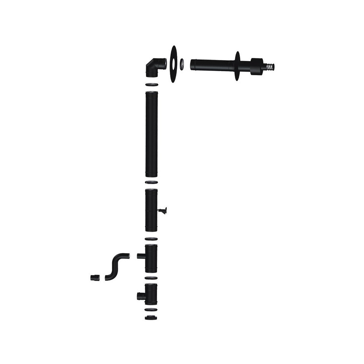 Kit de raccordement Poêle à Pellets Inox Noir, Installation en Ventouse Ø 80/125 (sortie façade) Kit de raccordement comprenant : 1 Flexible pour raccordement de l'arrivée d'air + 1 TE 90° piquage F + 6 colliers d'union + 1 TE piquage M + 1 Collier mural plat réglable + 1 Conduit de 0,5 mètre + 1 Conduit de 1 mètre + 2 Rosaces de finition + 1 Sortie Horizontal réglable Conduit étanche concentrique (double-flux) pour poêle à granulés étanche Ø 80/125. Permet l’évacuation des fumées (gaz de combustion) et l’entrée d’air simultanément. Avec une pose en ventouse l'extraction des fumées se fait via la façade de votre habitation ce qui vous facilite le montage. Epaisseur 0,4 mm Emboîtement de 50 mm Finition de sécurité anticoupure La conception de la ventouse dispose d'une forme spécifique (coupe vent) afin d'éviter que votre Poêle à Granulés se met en sécurité, si du vent s'engouffre dans votre installation Attention ce type de KIT D'INSTALLATION est uniquement autorisé en France pour une installation avec un Poêle à Granulés Étanche. Afin d'être conforme à la réglementation Française, votre Poêle à Granulés Etanche installé en sortie Ventouse doit respecter une hauteur de minimum 2 mètres Verticale entre le départ du T et le Trou de sortie de la Ventouse (ce kit d'installation vous permettra de régler la hauteur, si besoin une installation de plus de 2 mètres est possible avec option) Attention ce KIT d'installation ne fonctionne pas pour un Poêle à Bois, Poêle à Gaz, Poêle à Fioul (Poêle à Pétrole). Afin d'effectuer une sortie ventouse sur la façade, vous devez vous munir d'une carotteuse pour réaliser le trou de sortie de la ventouse. Attention, le Poêle à Granulés n'est pas compris dans le KIT Attention : le manchon raccord prise d’air (1F1) n’est pas fourni dans le kit Des joints (en silicone) peuvent être mis en option sur le kit.Spécifications techniques