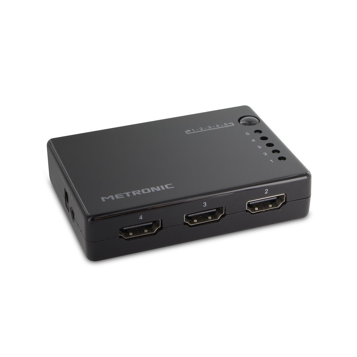 Le switch HDMI 5 ports METRONIC permet de brancher en simultané 5 appareils HDMI à votre TV afin d'éviter les débranchements fréquents. Très pratique, vous pourrez sélectionner la source HDMI à l'aide de la télécommande infrarouge ou avec le bouton situé sur le boitier et passer d'une source à l'autre très facilement. Dès l'allumage de l'un de vos appareils branchés sur le switch HDMI, il sera immédiatement diffusé sur votre télévision. C'est une solution multiport HDMI parfaite pour brancher l'ensemble de vos appareils en simultané.Spécifications techniques