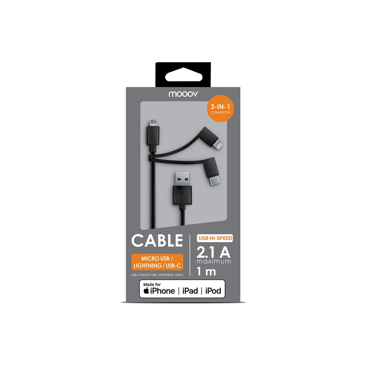 Câble USB-A 3-en-1 Lightning MFI-USB-C-micro-USB 1m - noir