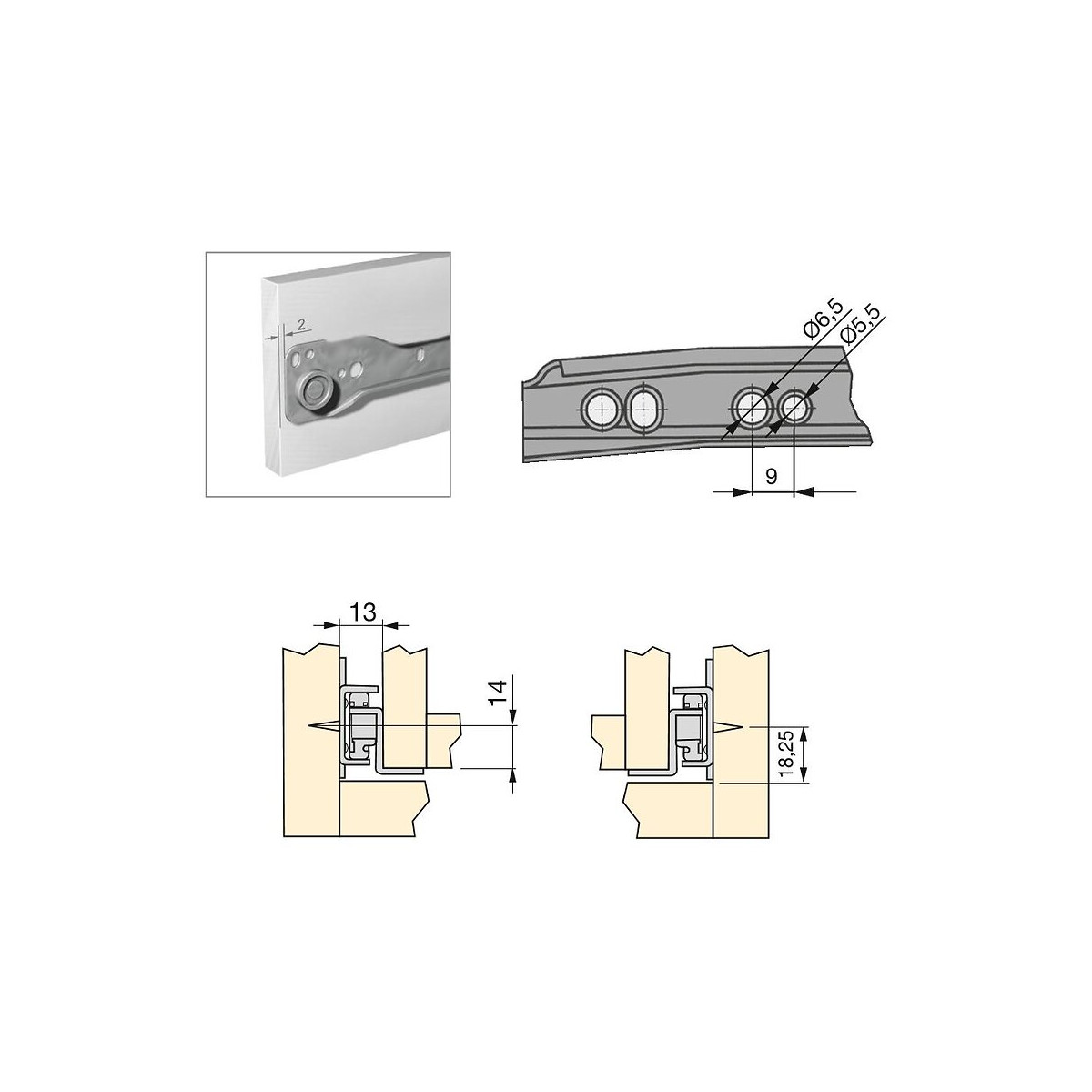 Coulisses à roulettes pour tiroir, fabriquées en acier finition couleur blanc, noir ou gris métallisé. Chaque paire est emballée individuellement. À installer sous le tiroiravec un peçage de diamètre 5 (avec eurovis diamètre 6,2 à tête fraisée) ou en les vissant directement sur le meuble (avec vis diamètre 3,5 à tête fraisée).Fermeture avec chute et capacité de charge jusqu’à 20kg pour une paire de coulisses.Possibilité de fermeture soft (non incluse).
