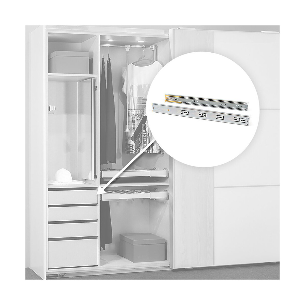 Coulisses à sortie totale pour tiroirs à fermeture amortie, dont les billes de haute qualité permettent un glissement doux et silencieux. Elles sont dôtées également d'une grande capacité de charge, pouvant supporter jusqu’à 35 kg par tiroir. Montage au moyen de vis et démontage avec la gâchette située sur la coulisse-même.