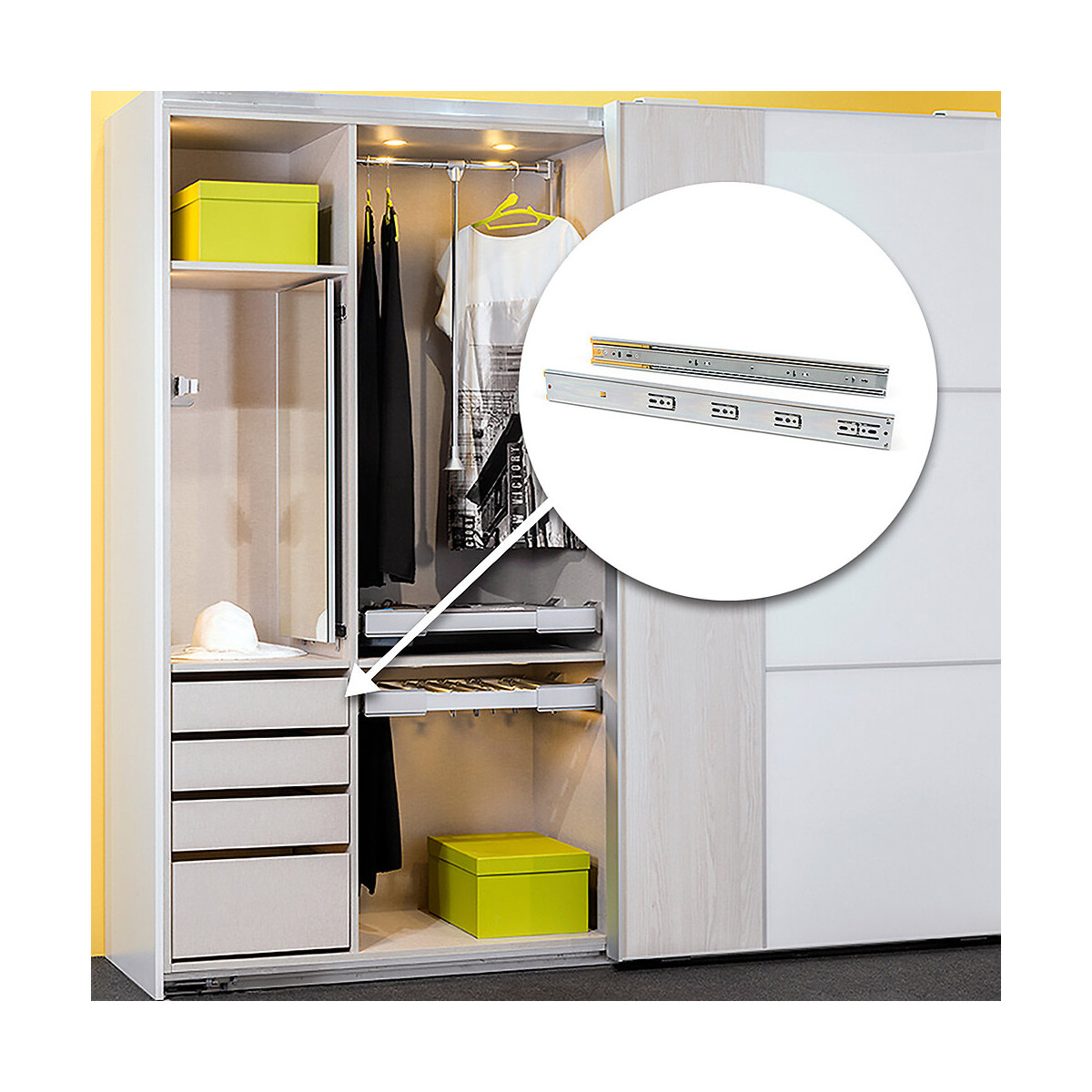 Coulisses à sortie totale pour tiroirs à fermeture amortie, dont les billes de haute qualité permettent un glissement doux et silencieux. Elles sont dôtées également d'une grande capacité de charge, pouvant supporter jusqu’à 35 kg par tiroir. Montage au moyen de vis et démontage avec la gâchette située sur la coulisse-même.