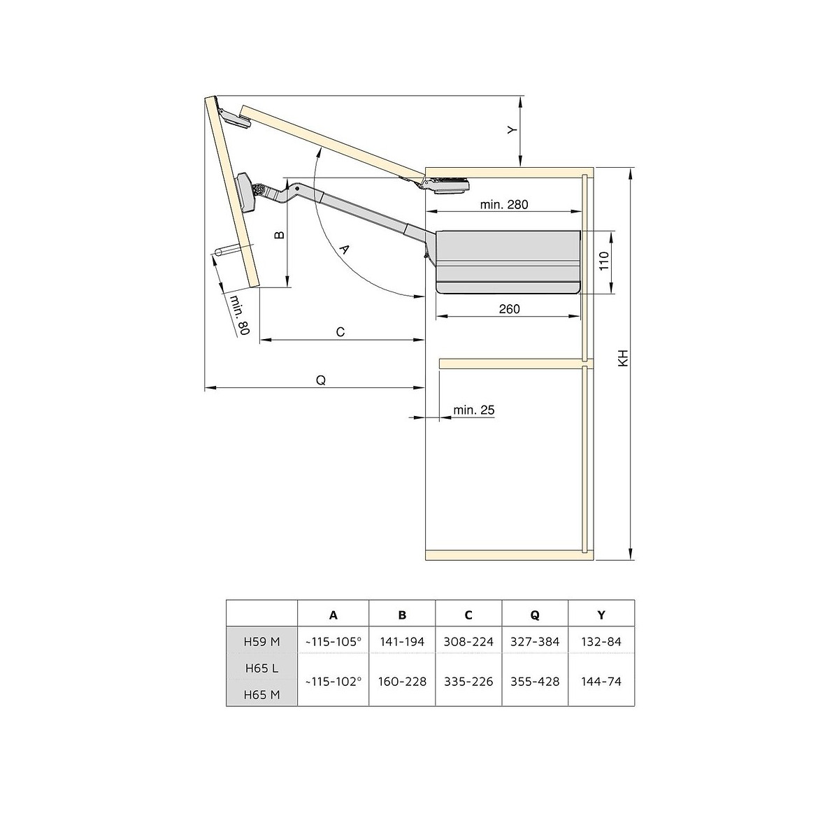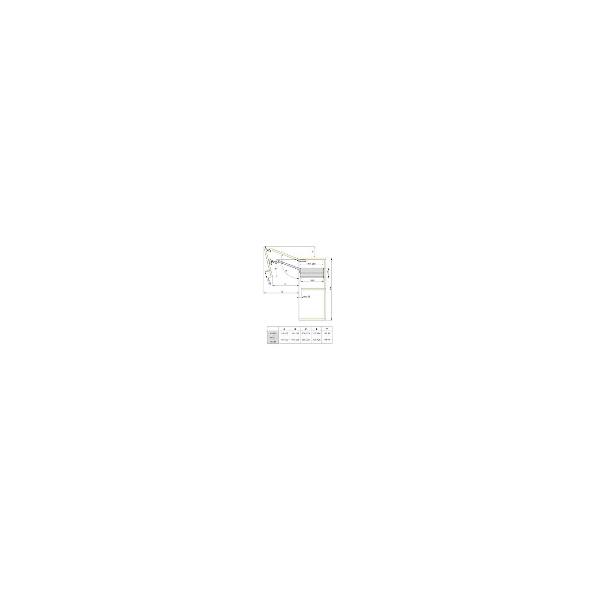 Système compas pour portes relevables doubles des armoires supérieures avec façades divisées, idéal pour une installation dans les meubles de cuisine et de maison. Il se distingue par son fonctionnement souple et précis, ne nécessite aucun outil pour le démontage de la porte grâce à son système de clipsage facile. Conçu pour les modules de deux portes d'une hauteur comprise entre 590 et 729 mm et largeur maximale de 1200 mm. Pour les modules à deux portes symétriques, seule la porte supérieure nécessite un montage sur charnière. Il dispose de trois réglages : réglage de la force du mécanisme, position tridimiensionnelle de la porte ±2mm et vitesse de fermeture douce. Il est disponible dans plusieurs gammes de force pour couvrir un plus large éventail de tailles et de poids de portes à choisir en fonction du résultat des formules de calcul. Le kit comprend 2 charnières supérieures à cupule, 2 charnières inférieures de porte sans cupule, des suppléments et des crochets de porte pour les charnières et les mécanismes, des couvercles de bras à cupule, des vis d'installation. CALCUL DE LA FORCE DU COMPAS: F = H x (poids de la porte + 2*poids de la poignée) F = Force. H = Hauteur de la porte en mm. Poids de la porte = Poids de la porte en kg. Poids de la poignée = Poids de la poignée en kg.
