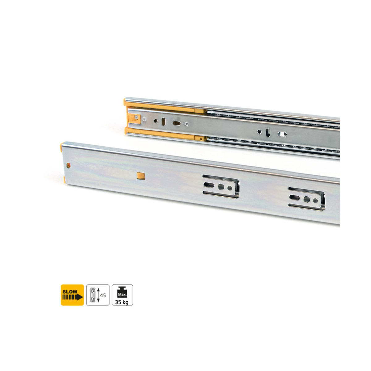Coulisses à sortie totale pour tiroirs à fermeture amortie, dont les billes de haute qualité permettent un glissement doux et silencieux. Elles sont dôtées également d'une grande capacité de charge, pouvant supporter jusqu’à 35 kg par tiroir. Montage au moyen de vis et démontage avec la gâchette située sur la coulisse-même.