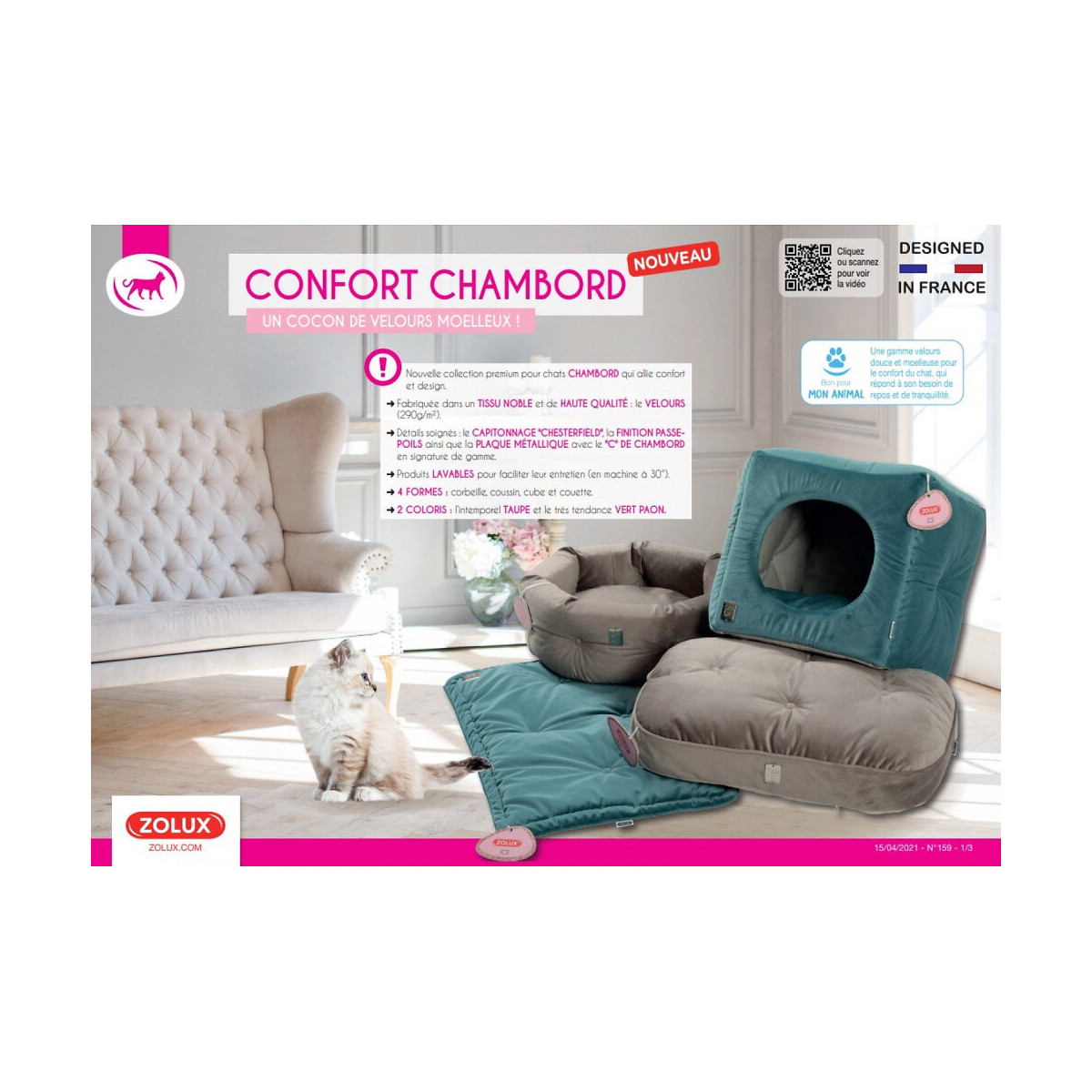 Couette Chesterfield Chambord Vert Paon. 59 Cm. Pour Chats. - Zolux - Zo-500249
