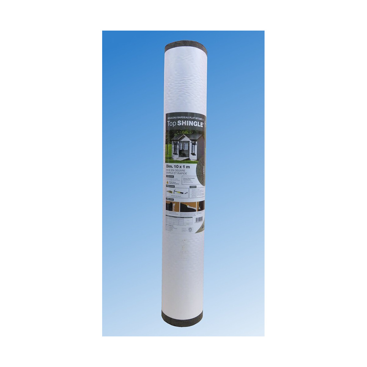 Rouleau bardeau plat bitumé CE 10 x 1m. Coloris vert. Pour couverture d'appentis, chalets de jardin, garages, carport, niches,... Stockage debout à l'abri. Se cloue, se colle. Pente mini >10%. Garantie 10 ans.