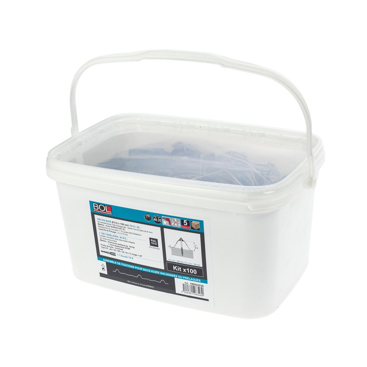 100 vis + cavaliers pour fixations de bac RAL 7016.