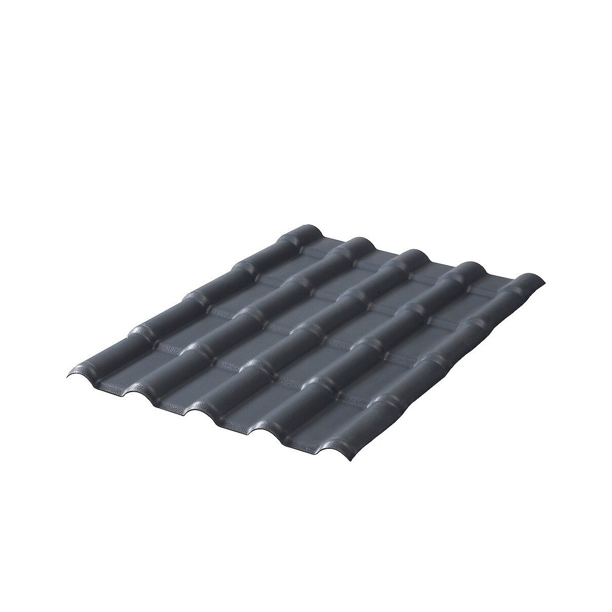 Plaque de couverture en PVC imitation tuile. Coloris gris. Dimensions : 222 x 75cm - Modèle Express. Très résistant aux chocs. Traité anti UV. Insensible aux variations climatiques, à l'humidité et aux agressions naturelles. Pose facile avec kit de fixation composé de 50 plaquettes, 50 vis, 50 rondelles d'étanchéité et 50 capuchons. Parfait pour couvrir hangars, abris de jardin, auvents, couvertures secondaires. Pour la découpe utiliser une scie circulaire. Pré percer la plaque et prévoir des trous légèrement plus grands pour la dilatation linéaire.