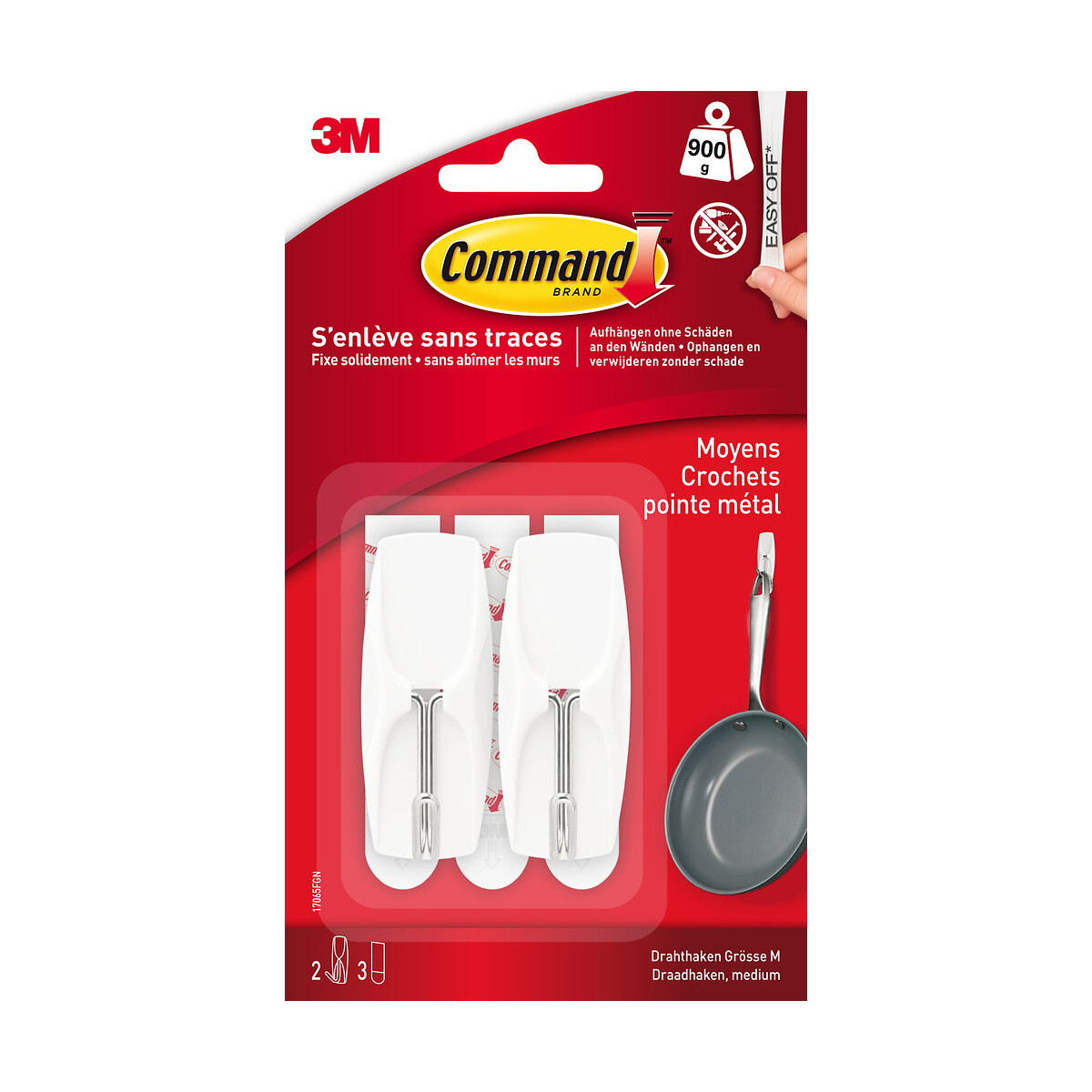 2 crochets plastiques pointe en métal moyen modèle blanc avec 3 languettes de fixation adhésives enlevables - Charge maximale supportée : 900g - Fini les clous, les vis et les punaises, les crochets Command™ s'accrochent solidement et facilement sur différents supports (surfaces peintes, en bois, carrelées, et plus encore ...). De plus, elles s'enlèvent proprement en ne laissant ni trou, ni marque, ni résidu collant.Spécifications techniques