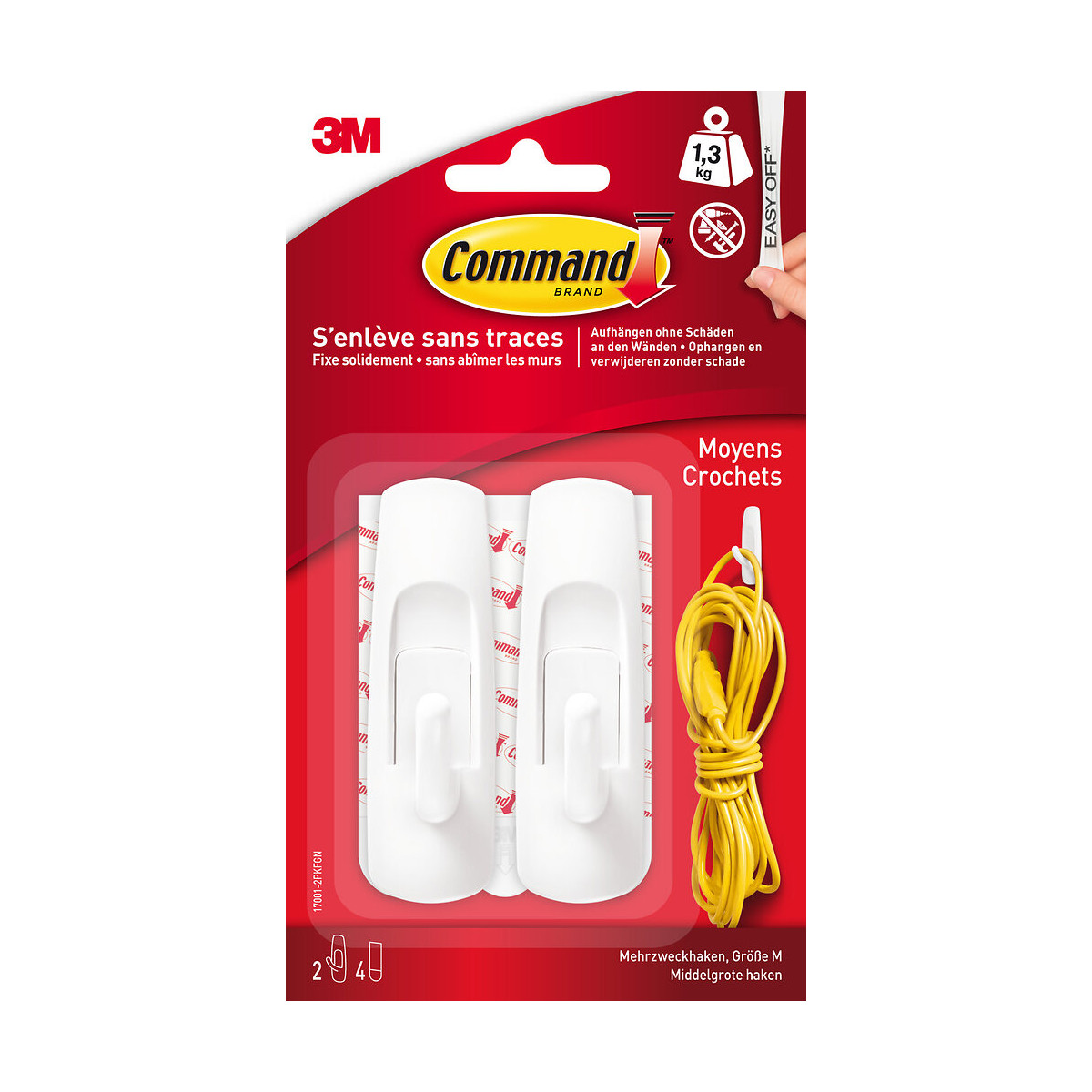 2 crochets plastique blanc moyen modèle avec 4 languettes de fixation adhésives enlevables - Charge maximale supportée : 1.3 kg - Fini les clous, les vis et les punaises, les crochets Command™ s'accrochent solidement et facilement sur différents supports (surfaces peintes, en bois, carrelées, et plus encore ...). De plus, elles s'enlèvent proprement en ne laissant ni trou, ni marque, ni résidu collant. Si vous souhaitez déplacer les crochets, il suffit d'appliquer une nouvelle languette adhésive Command™ qui vous permettra de les fixer et les réutiliser à volonté !Spécifications techniques